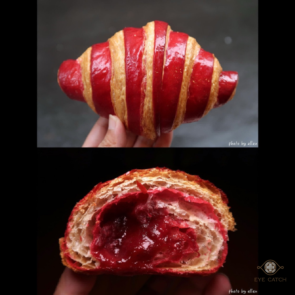 回顧過去一年吃過的無數可頌, 外觀最工整漂亮非這款開心果可頌莫屬! 彎成半月形, 中間開心果餡佔滿將近1/3的厚度, 混有櫻桃果醬酸甜不易膩, 而開心果蛋糕中間夾熱帶水果慕斯與果膠, 層層堆疊風味不錯