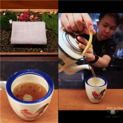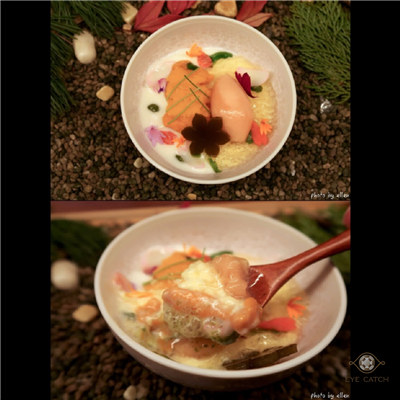 飲料有: 薑汁檸檬康普茶, 咖啡洛神接骨木花, 芭樂白巧克力蕎麥, 蔓越莓胡椒杜松子; 餐點有: 葡萄蝦, 真鯛, 法國奶油昆布鹽餅乾脆片&酸種麵包, 鍋燒意麵茶碗蒸, 馬頭魚, 鱈魚白子, 胭脂鴨, 柚子慕斯, 萬壽菊香蜂草薄荷混合花草茶, 柿, Petit four