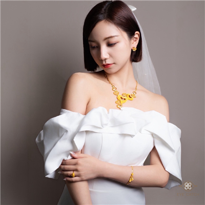 足金色澤溫潤明亮,搭配禮服與正式服裝能清楚呈現黃金的份量感,無論拍照或實際佩戴皆顯大器,適合希望在重要儀式中展現誠意與祝福的新娘。