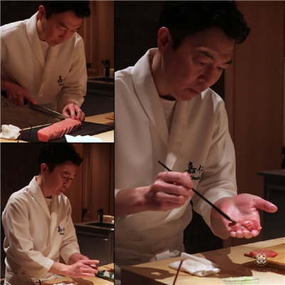 台灣檜木製成的L型吧檯搭配日本漆器, 板前可坐11人, 食材皆從日本進口, 當日晚餐一共20樣: 北海道毛蟹魚子醬, 愛媛星鰻苗, 宮城炙燒鯖魚, 北海道鮟鱇魚肝, 山口河豚白子, 薑與蘿蔔, 明石鯛, 山口障泥烏賊, 千葉水針, 宮城赤貝, 茶碗蒸, 青森一本釣り中腹, 青森大腹, 佐賀小肌, 高知縞鯵, 富山白蝦, 北海道海膽, 千葉蛤蜊, 味噌汁, 特製壽司捲, 玉子燒, 甜點草莓大福