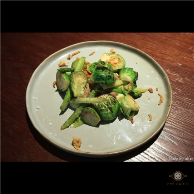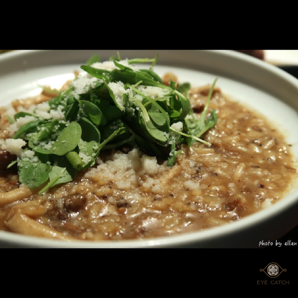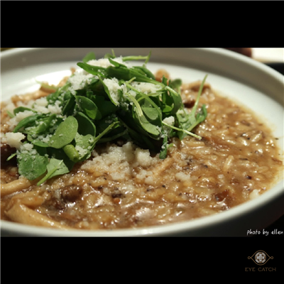 我們點了: 蘆筍孢子甘藍佐牛肝菌菇薯泥, 松露百花臭豆腐, 蒼蠅頭煎餃, 核桃培根營養三明治, 宮保鹹酥金瓜鳥巢麵, 牛肝菌菇野菇燉飯
