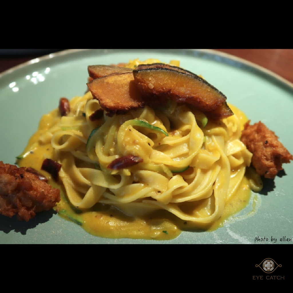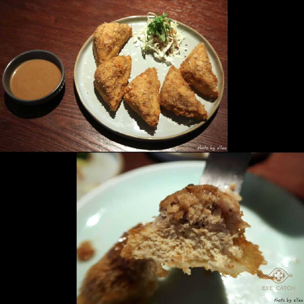 南瓜義大利麵和牛肝菌菇燉飯還有孢子甘藍中規中矩, 不過臭豆腐/煎餃/營養三明治讓人印象深刻, 尤其蒼蠅頭煎餃適合重口味的人, 而營養三明治的布里歐麵包非油炸而是烘烤而成, 中間的蜜核桃酥脆又無油耗味完全加分! 臭豆腐非一般常見炸法, 裹麵包粉, 臭味和松露胡麻醬滿合, 其實我沒很愛植物肉, 意外地這天吃到的都頗喜歡 ;)