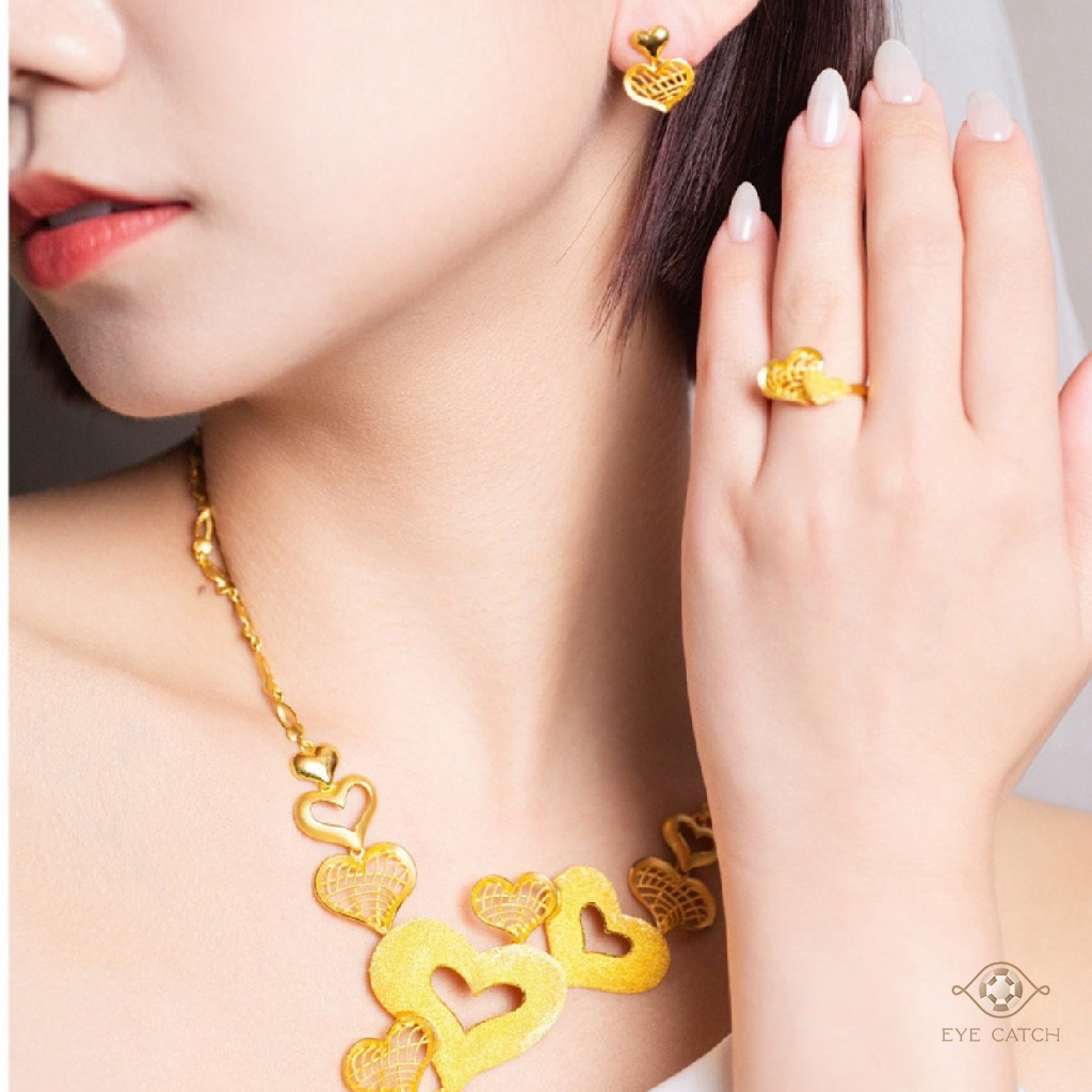 這款是愛心黃金配飾套組,是甜美又有份量感的愛心元素,整體線條圓潤、細節精緻,戴起來很顯甜蜜幸福氛圍,非常適合拍照上鏡。