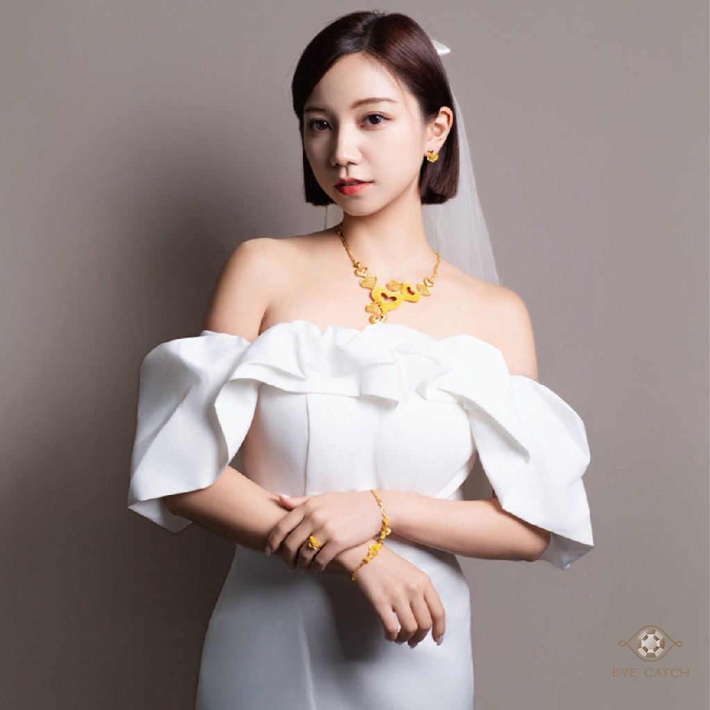 足金色澤溫潤明亮,搭配禮服與正式服裝能清楚呈現黃金的份量感,無論拍照或實際佩戴皆顯大器,適合希望在重要儀式中展現誠意與祝福的新娘。