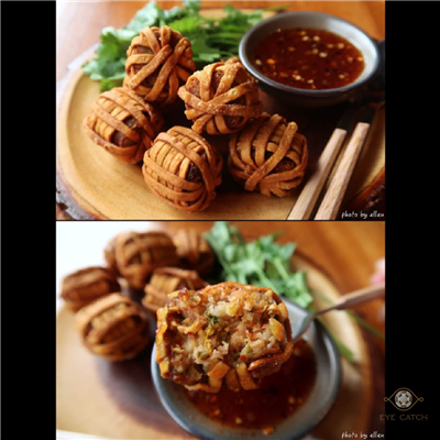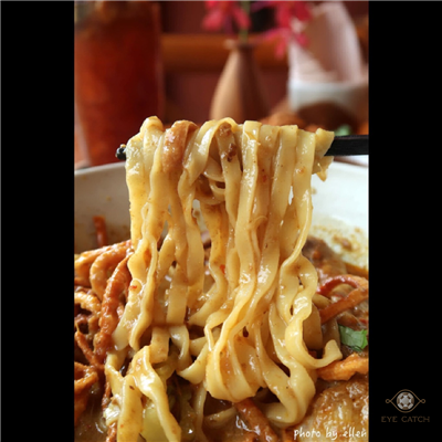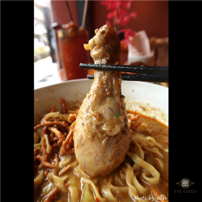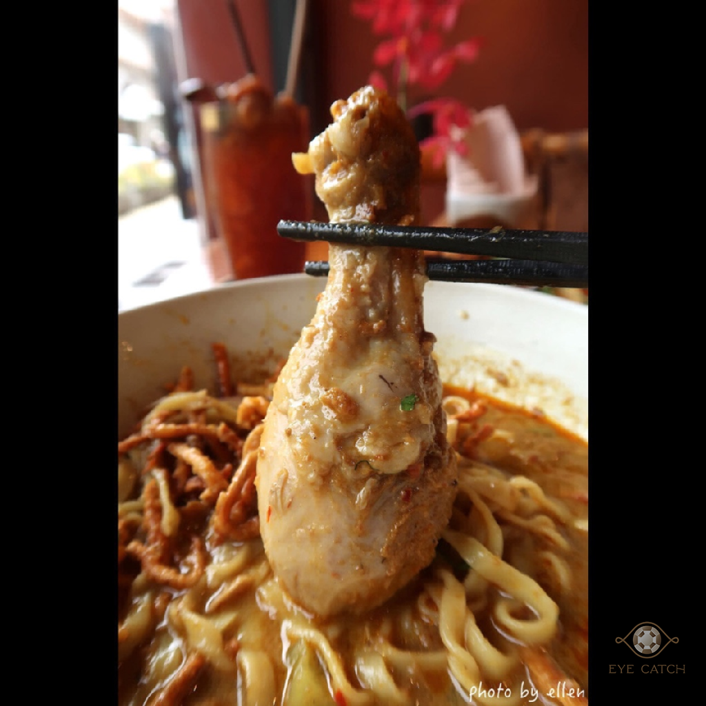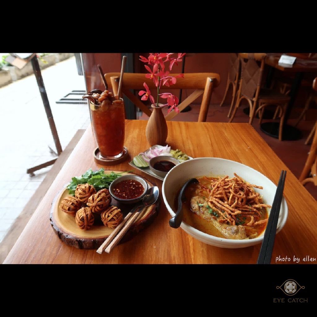 點了龍眼木敦果汁, 炸泰北香腸籠球, 雞腿咖哩麵; 籠球像一捆捆毛線球一樣炸到金黃酥脆, 包泰北香腸特色帶酸, 不需沾醬已很夠味; 咖哩麵湯量看起來不多, 椰奶湯底滿濃, 麵條不算很有彈性但不會太軟, 雞肉很好去骨, 整體表現不錯
