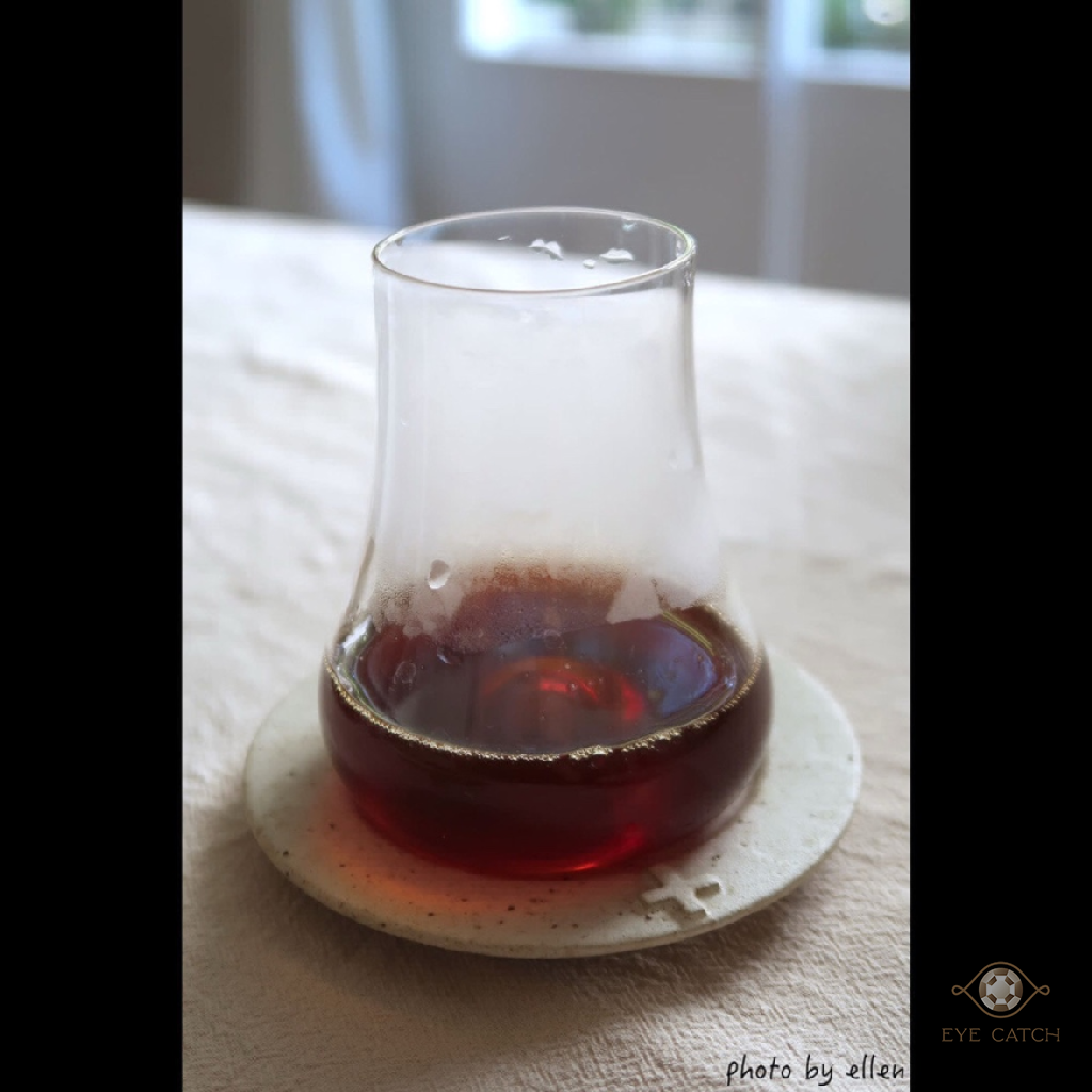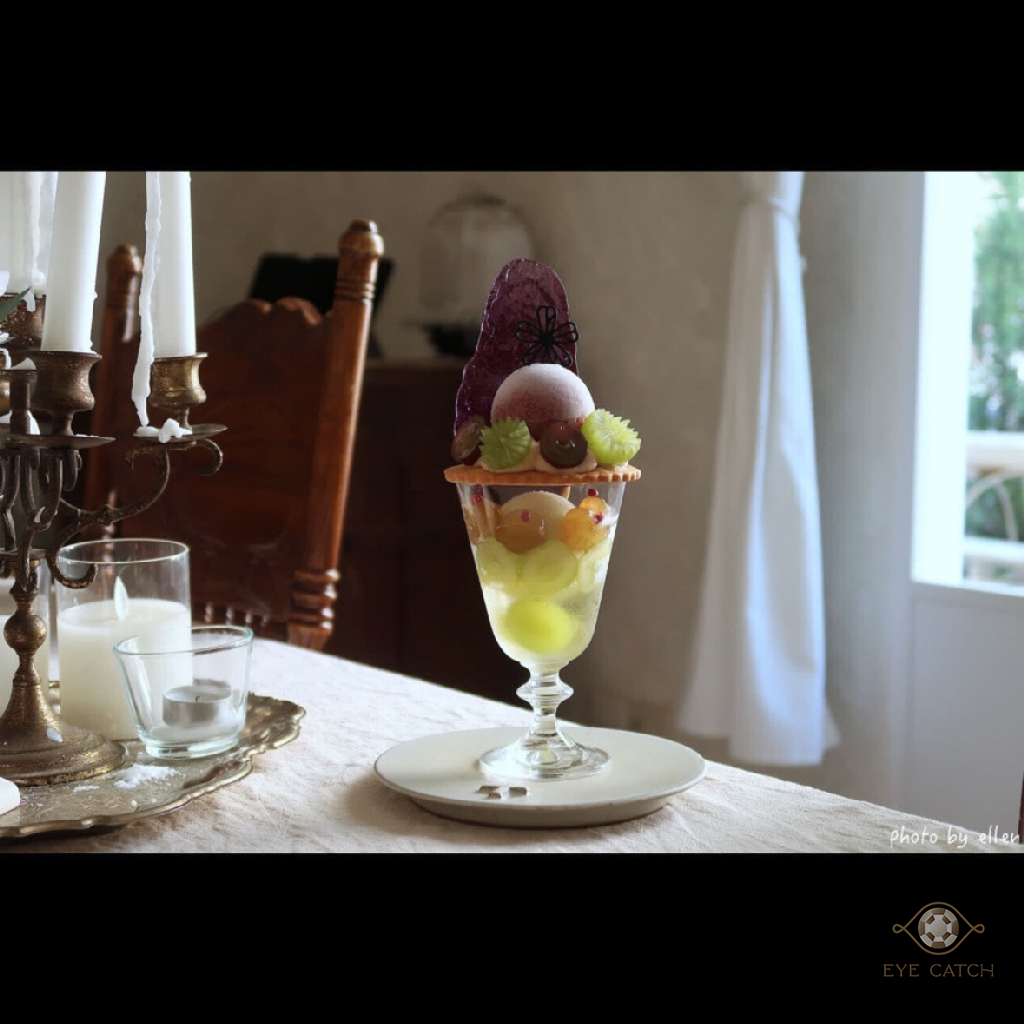 花香葡萄聖杯, 將上面奶油酥餅整組取下放在小盤子裡, 葡萄雪酪放回杯中連同底下的哈密瓜茉莉花雪酪和葡萄酒凍一起享用, 巨峰葡萄雪酪微甜偏酸香氣足, 哈密瓜茉莉花雪酪清爽淡雅, 風味層次豐富