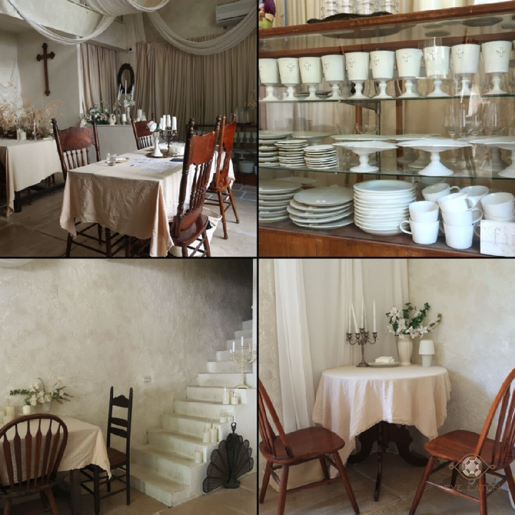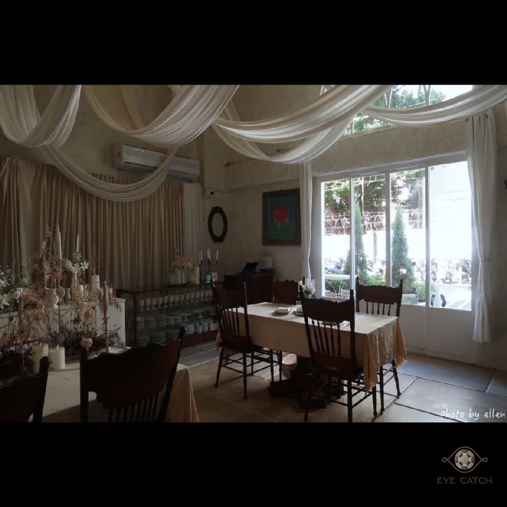 馥約在中原大學恩慈小門前, 純白色獨棟外觀近兩層樓高的窗門設計像教堂, 挑高天花板佈滿帷幔, 復古經典桌椅擺設和餐具, 空間不大但氛圍不錯, 闆娘說從粉刷牆壁到掛布幔都自己弄蠻厲害