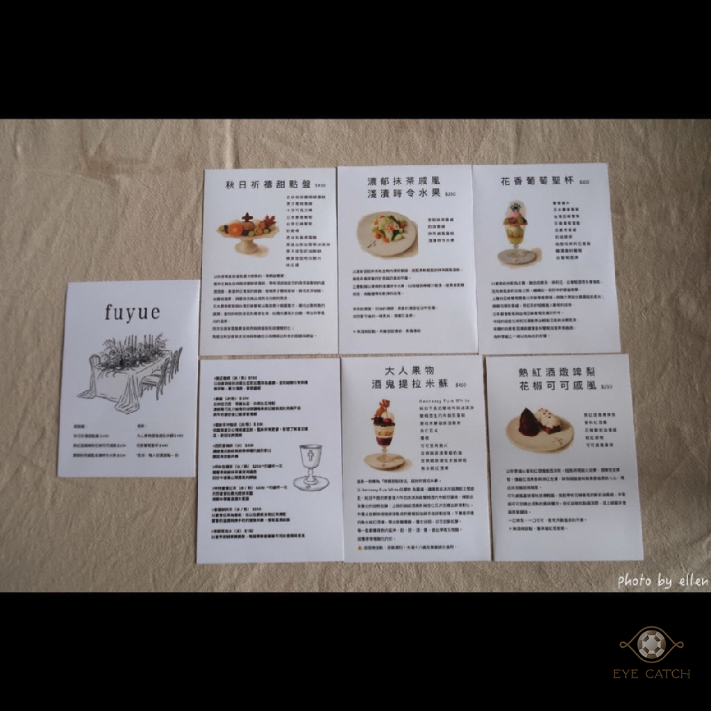 週五中午只有我一個客人, 闆娘讓我任選座位, 低消每人一份甜點, 預約時先點餐, 到現場還有機會可加點, 不定期依季節推出新品, 剛好秋冬之際新推出提拉米蘇和可可戚風這天也點得到, 來之前訂了花香葡萄聖杯, 到現場覺得還吃得下第二個, 加點了可可戚風