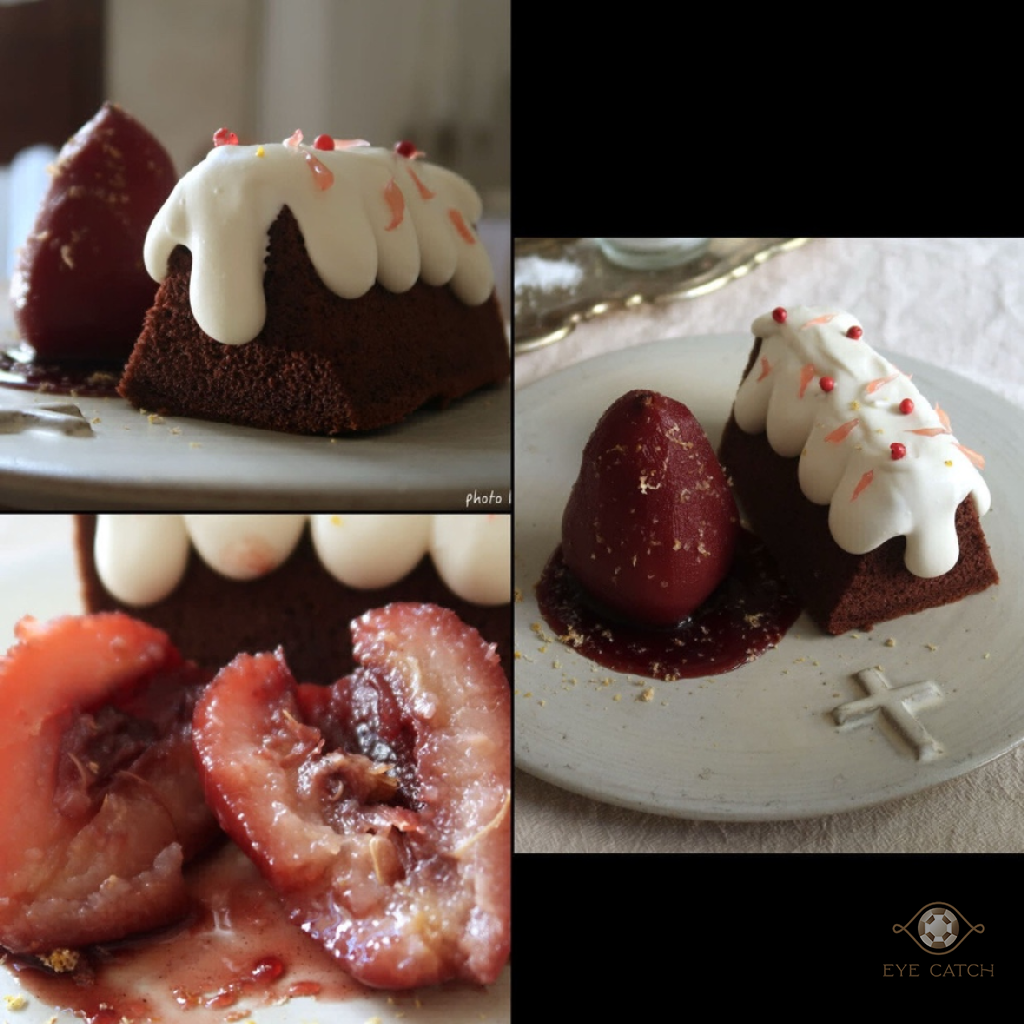 熱紅酒燉啤梨花椒可可戚風以熱紅酒為發想, 燉啤梨仍帶有脆度, 淡淡熱紅酒香氣淡淡梨子清甜, 可可戚風蛋糕鬆軟輕盈苦味濃, 適逢耶誕佳節, 很應景的甜點