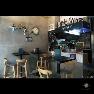 空間小巧可坐8人左右, 桌椅設計挺有趣, 檯面稍窄不能放太多東西, 後來發現圓形窗戶是可以打開的, 外帶直接在窗外點餐即可