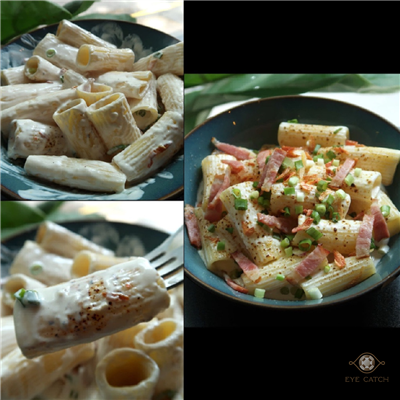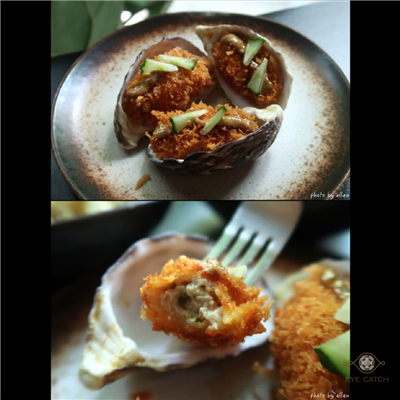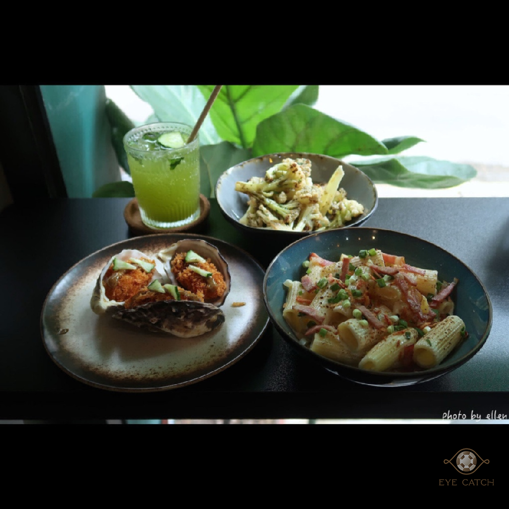 炸蠔我選泰式青咖哩蛋黃醬, 酥脆無腥味, 綠咖哩幾乎不太能感受到, 但小黃瓜能解膩~ 花椰菜有烤製的黑油與焦香, 沾義大利麵的白醬像奶油焗菜意外好吃! 義大利麵奶味不像台灣的很多時候是奶粉香, 比較像酸奶鮮奶油混合, 有香氣但不過重, 培根和櫻花蝦建議大家加, 不然容易膩, 水管麵軟硬剛好是我喜歡的口感