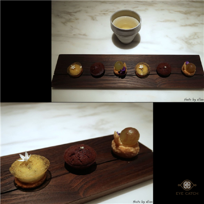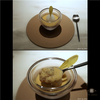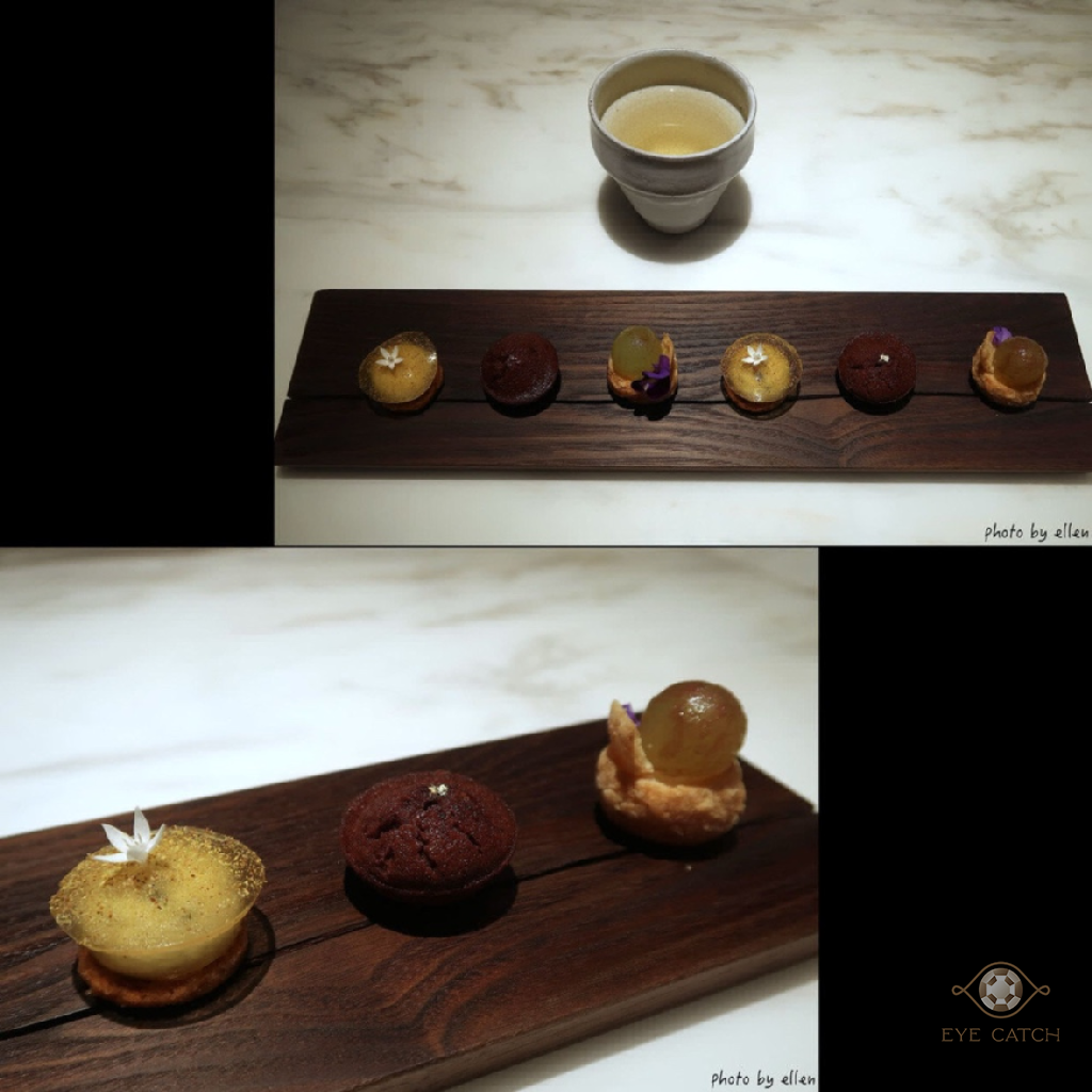 花香葡萄聖杯, 將上面奶油酥餅整組取下放在小盤子裡, 葡萄雪酪放回杯中連同底下的哈密瓜茉莉花雪酪和葡萄酒凍一起享用, 巨峰葡萄雪酪微甜偏酸香氣足, 哈密瓜茉莉花雪酪清爽淡雅, 風味層次豐富