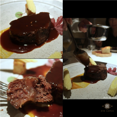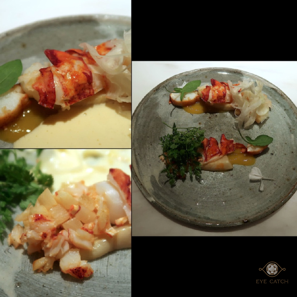 那天有: 玉米冷湯, 麵包佐橄欖油與鹽, 龍蝦, 牛頰, 香蕉酒粕可麗餅, 茶&petit four