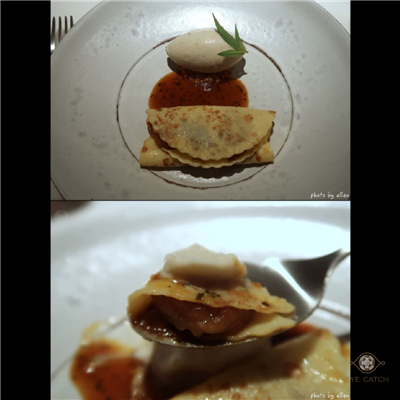 對兩道羹湯和陳醋牛筋與咕咾肉還有椒麻脆皮豆腐留下較深刻的印象, 尤其羹湯裡的花膠真的讚! 片皮鴨特別的是配料有鳳梨, 特製甜麵醬加了金棗, 餅皮加蕎麥子, 一點也不突兀, 意外和諧