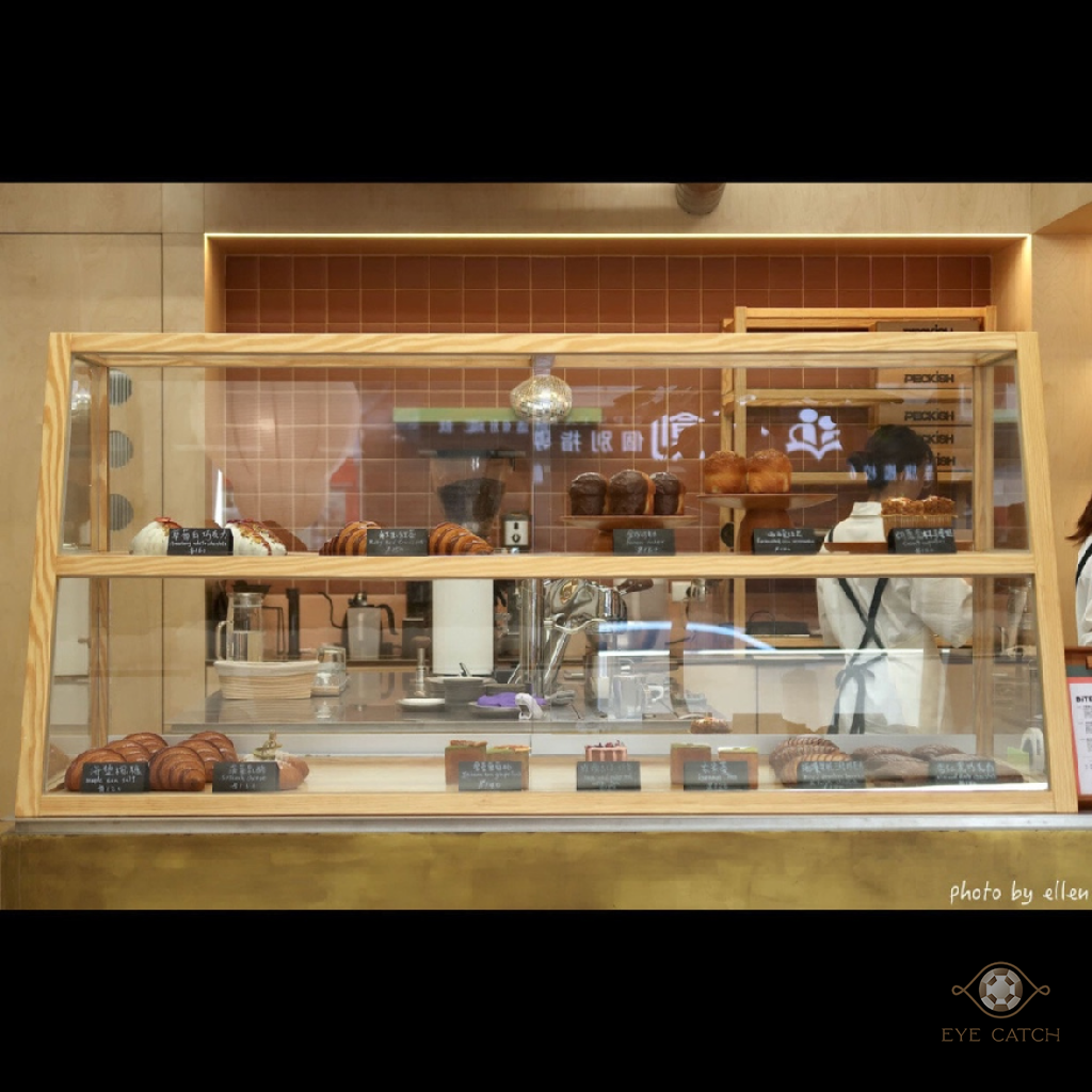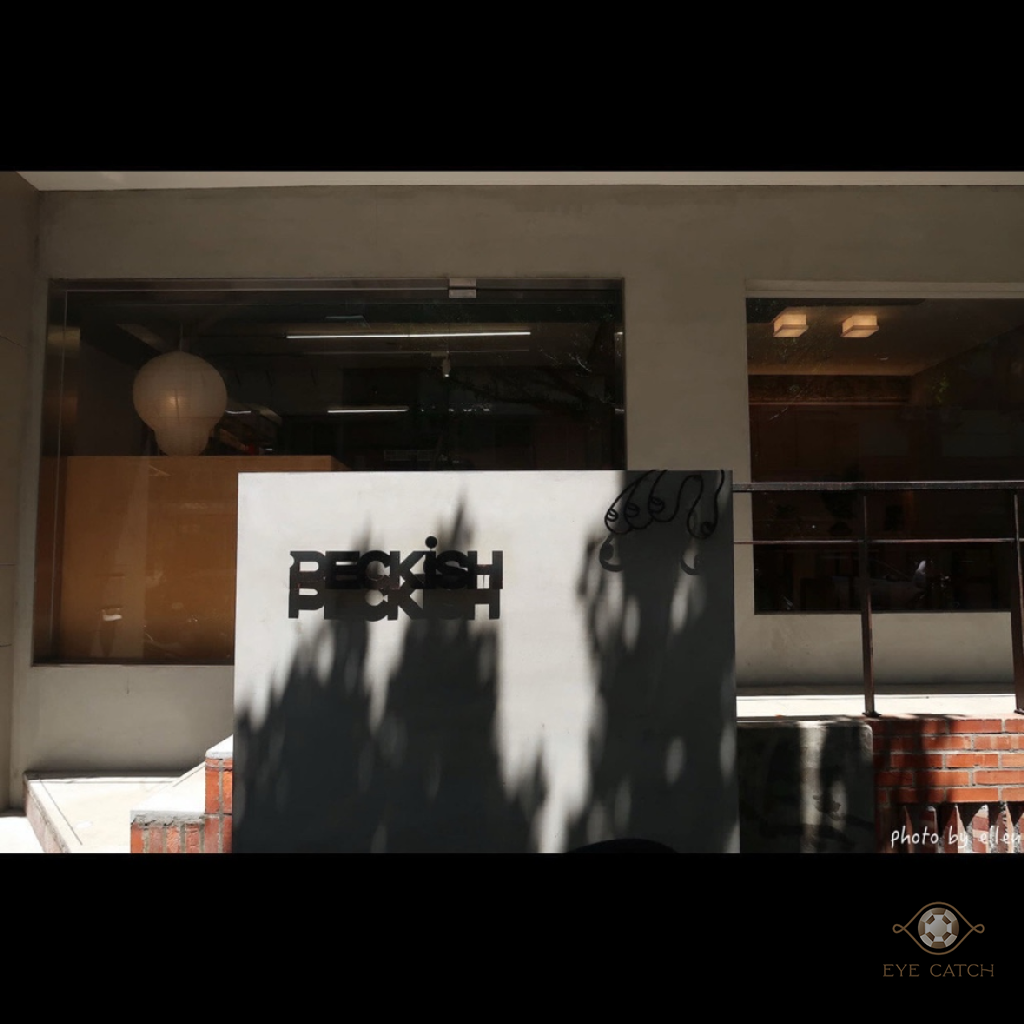 PECKiSH位在延壽街上, 門前幾階樓梯, 外觀看不出是什麼店, 若非知道他們賣麵包甜點和咖啡, 路過瞥見裝潢與燈具可能會以為是家具家飾店之類! 寬敞明亮, 座位分三區, 桌距不會太近, 平日上午僅三組客人各據一區很安靜, 綠色植栽搭配木傢俱和咖啡橘椅, 色調清新有活力