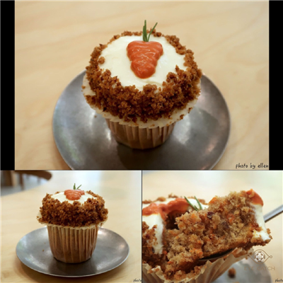 椰子水比例過半, 濃縮咖啡鮮奶油上面用椰蓉點綴, 奶蓋不甜帶咖啡的苦, 攪拌後風味更佳; 香蔥丹麥回烤後鵝油蔥香十足, 外層酥脆中間柔軟濕潤層次明顯; 胡蘿蔔蛋糕十分可愛, 乾爽鬆軟, 雖然切時容易散, 但味道好
