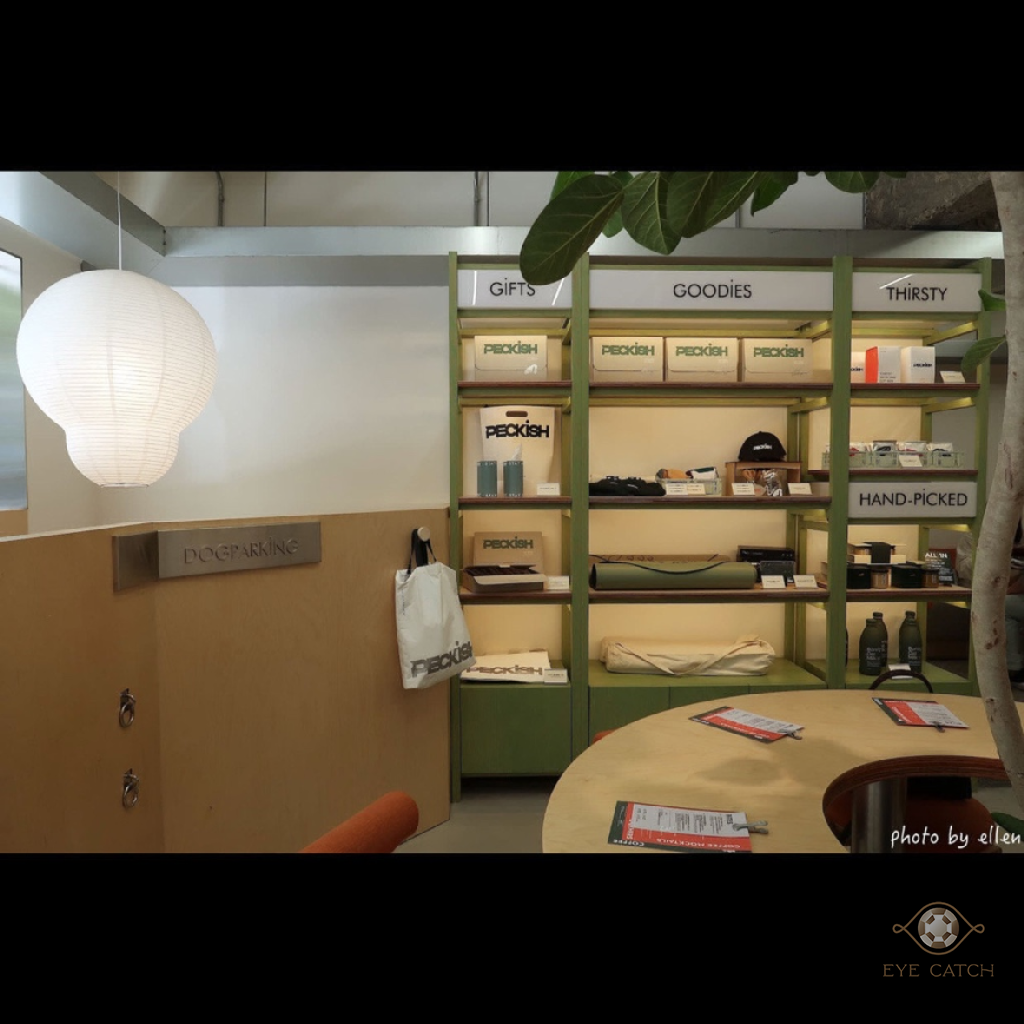 周邊商品櫃左側鐵牌定睛一看寫著DogParking一開始還不知為何, 看到左邊扣環恍然大悟, 原來可以帶寵物來, 這塊是寵物專屬休息區