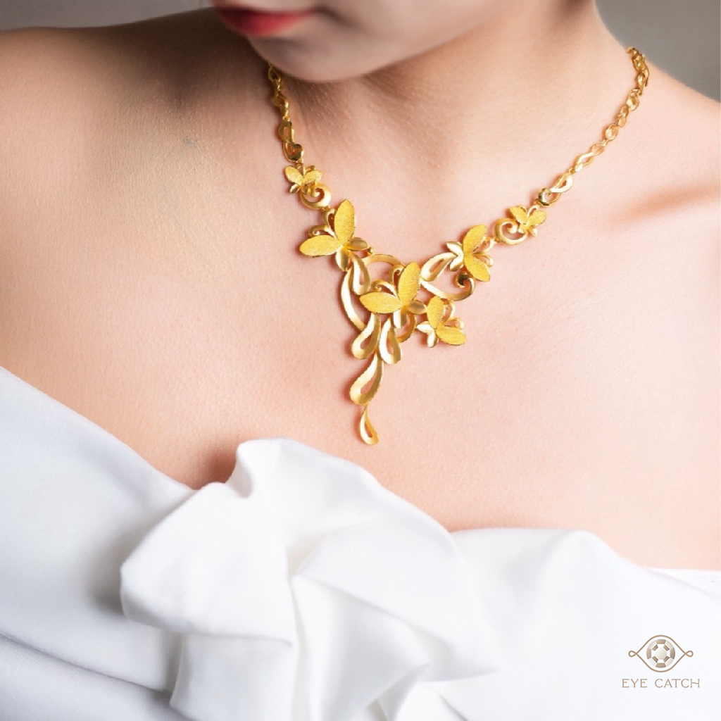這款品名:「翩翩」-蝴蝶花語金項鍊,花葉層次立體、線條華麗,上身顯白又有福氣感,迎娶、奉茶、宴客、全家福拍照都超加分;再搭配同系列手鍊與戒指,整套更完整,儀式感到位,長輩一看就放心、新娘也更有底氣。