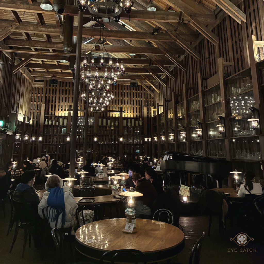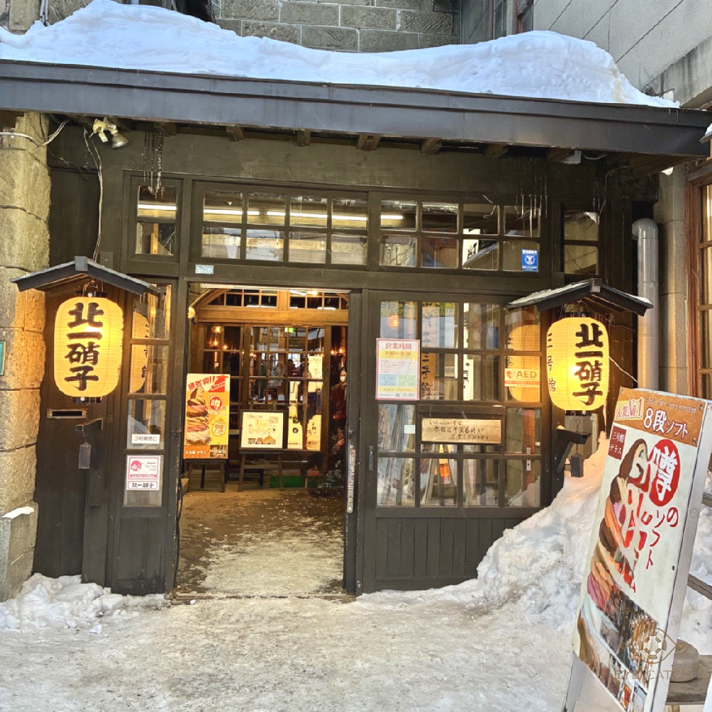 這裡其實是小樽百年硝子名店北一硝子三號館的一部分,是全小樽最有氣氛的咖啡館。木造梁柱、復古牆面、世界地圖裝飾,加上滿室閃閃發光的油燈,氣氛直接拉滿,浪漫到連講話都會自動放輕音量。