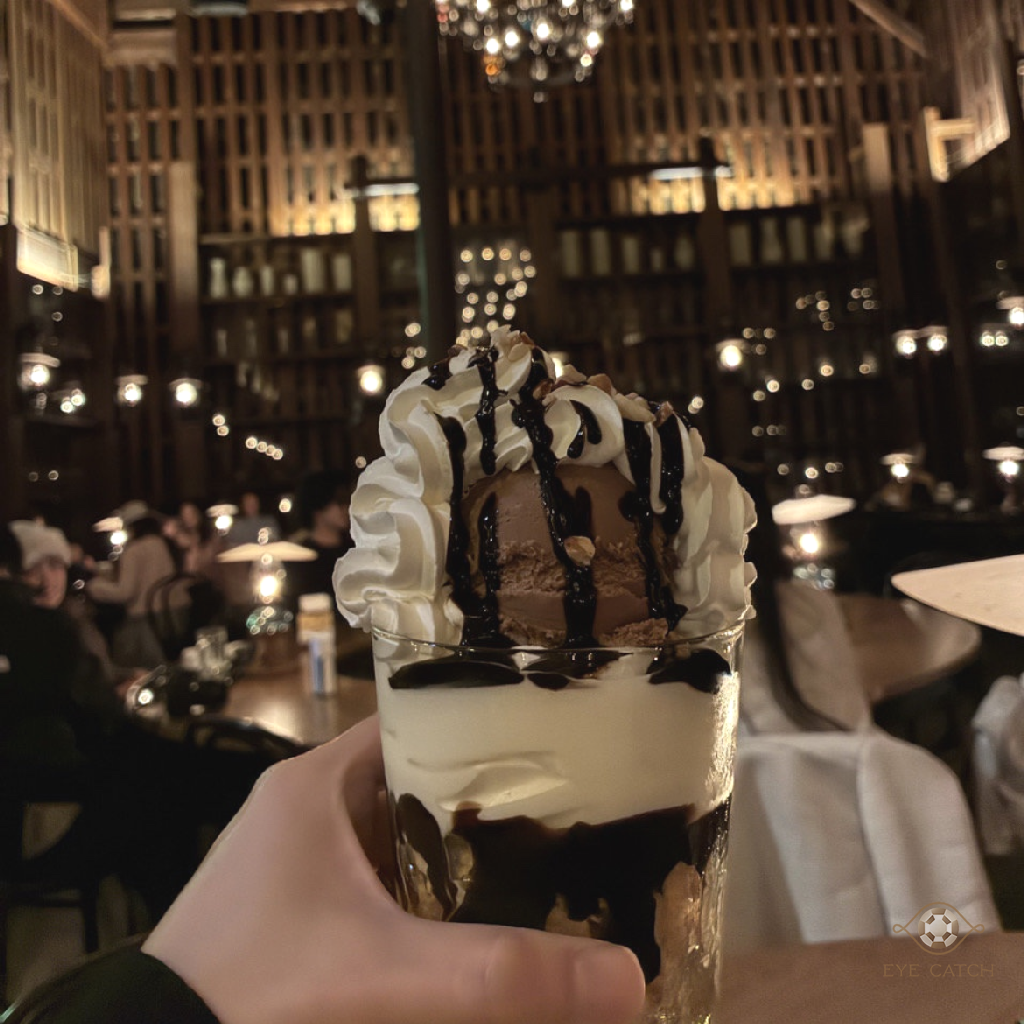 巧克力聖代⋯好看不好吃,哈哈🤣但手邊那盞玻璃油燈,透著藍綠色的玻璃光澤,火苗在裡頭跳舞,完全就是小樽最經典的「硝子美學」。