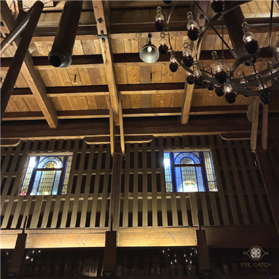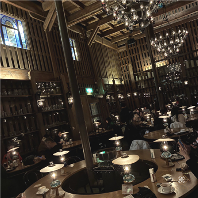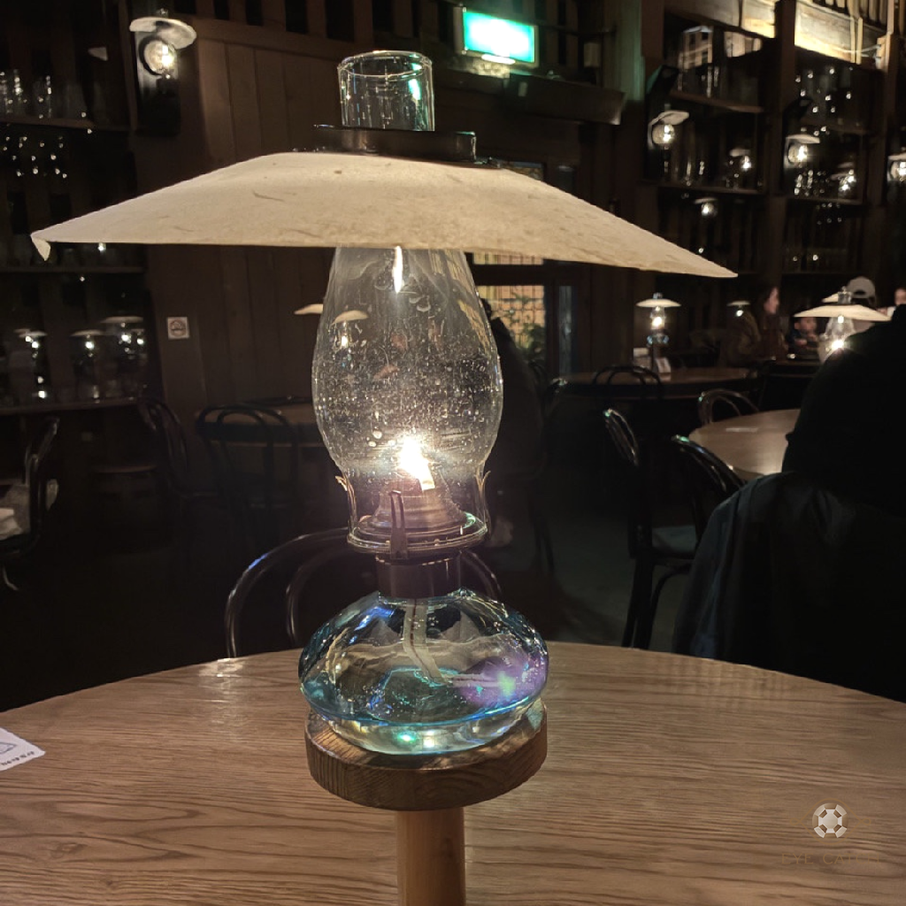 天花板上垂掛著一整圈油燈吊燈,桌上也放著一盞盞玻璃油燈,燈芯微微晃動,火光暖黃,空氣裡瀰漫著一種「時間變慢了」的氣味。
