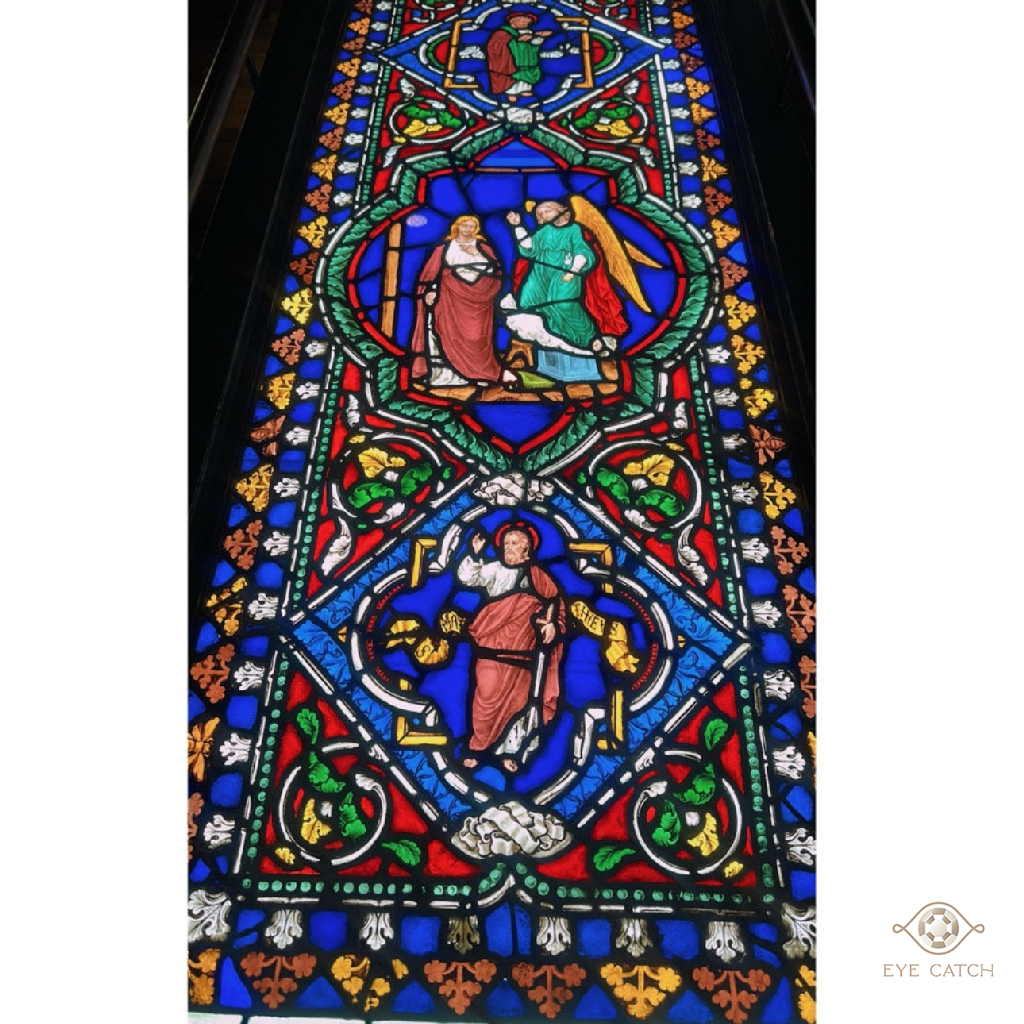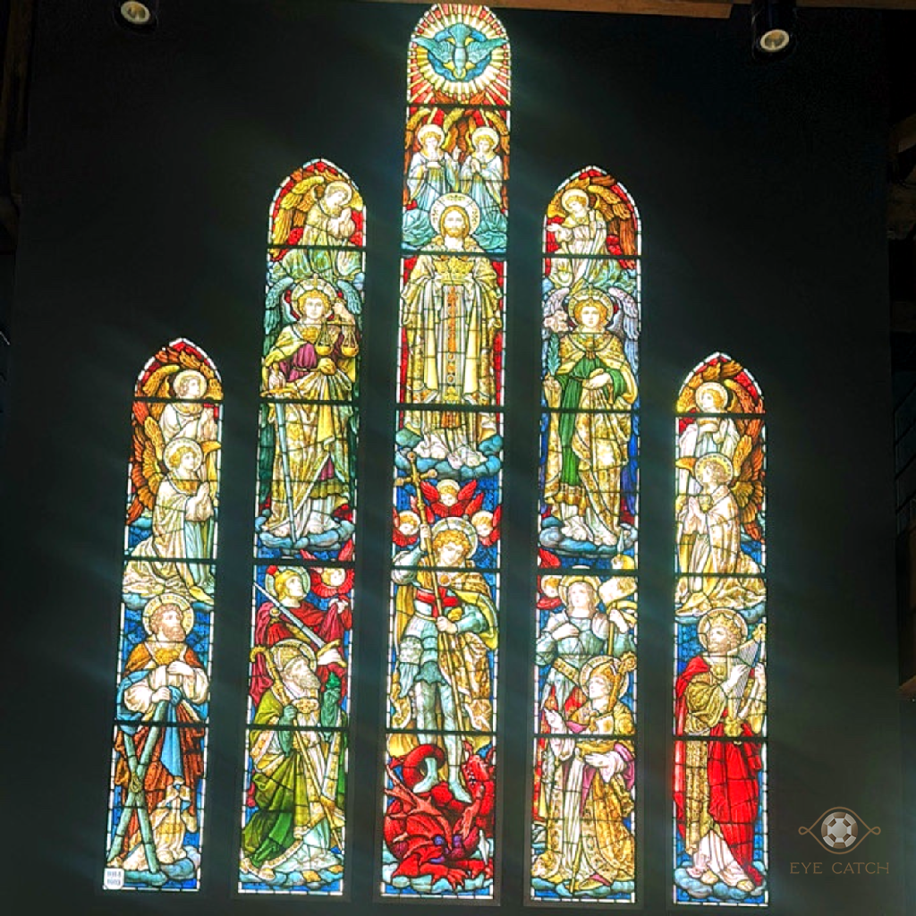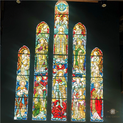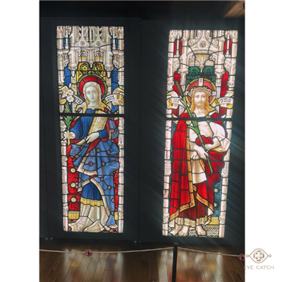 其中一件《神與英國的榮光》(1919年,英國)為紀念第一次世界大戰所製,五扇直立拱形窗排列在一起,畫面中耶穌為英格蘭守護聖人聖喬治加冕,右側還描繪法國聖女貞德,象徵兩國並肩作戰。