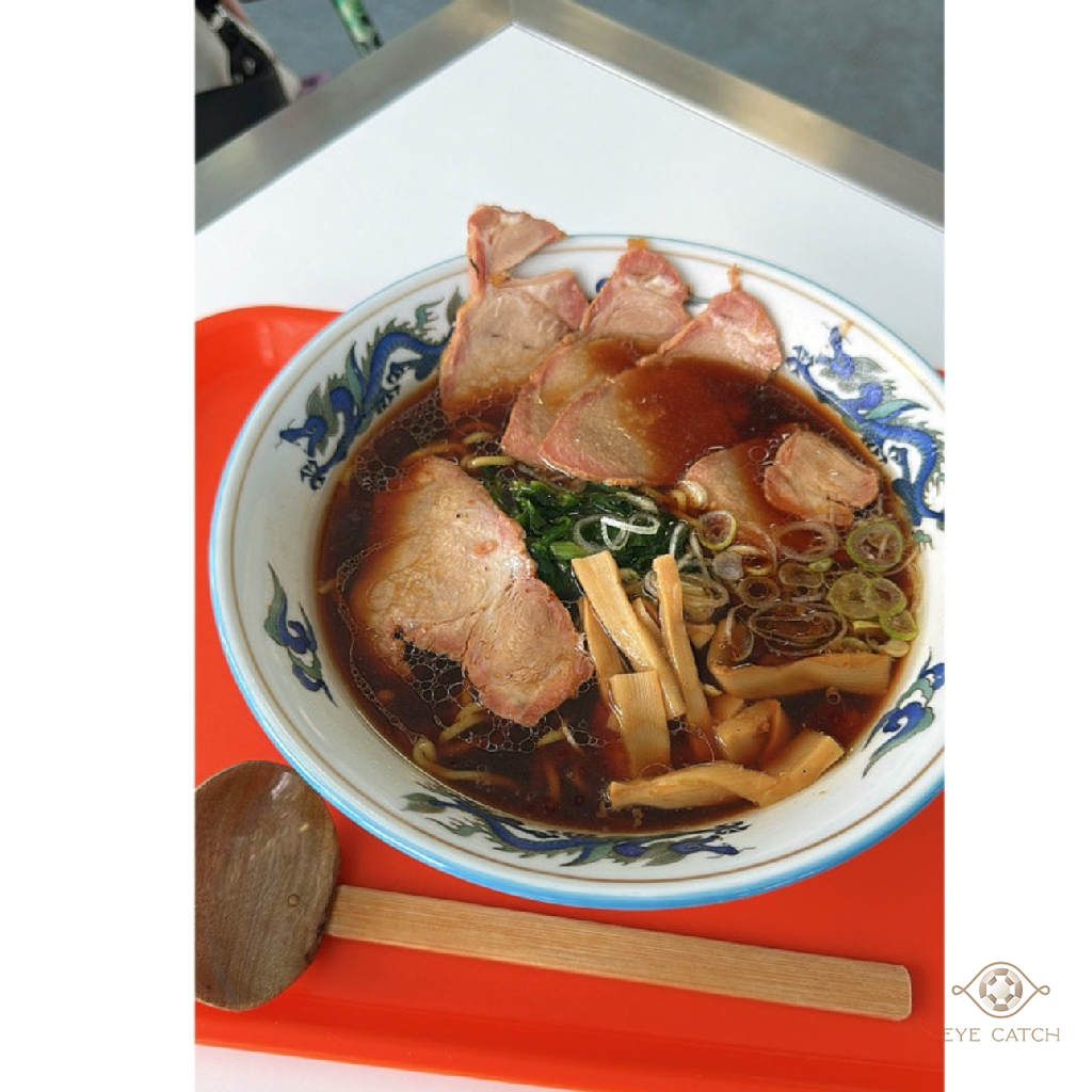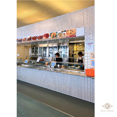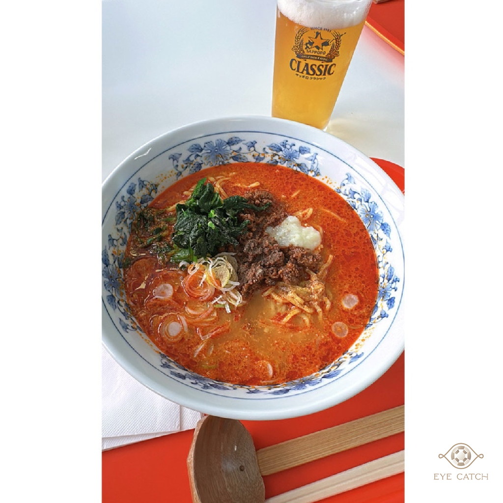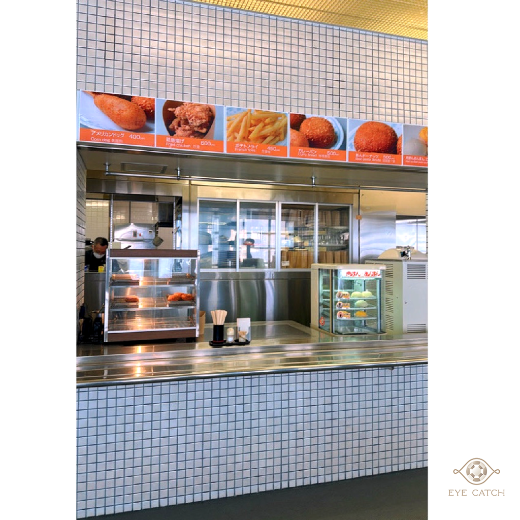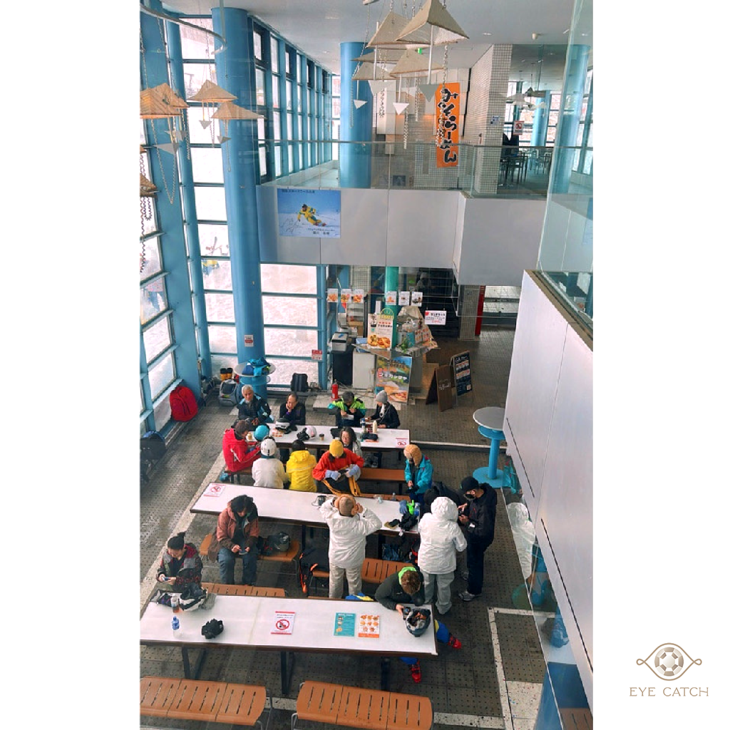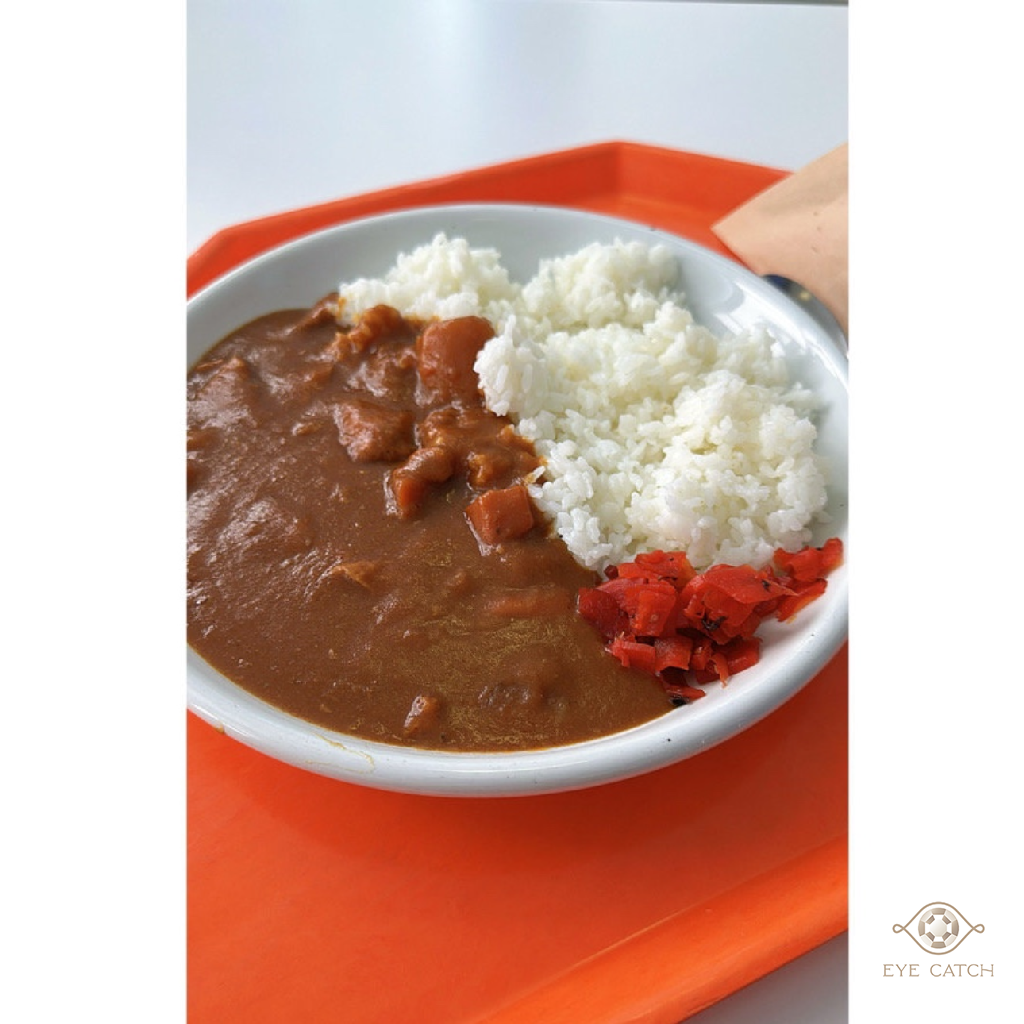 大面落地窗、整齊長桌、空氣裡瀰漫著熟悉的食物香味,大家穿著雪衣排隊點餐。端著橘色托盤坐下,咖哩的濃香混著紅色漬菜的微酸,一口白飯下去,心裡那種熟悉的滿足感瞬間湧上來