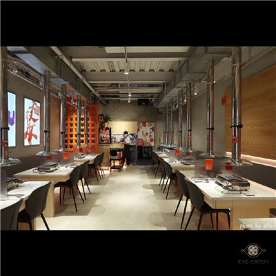 金門肉坊開來台灣本島的第一間店, 裝潢明亮有設計感, 低消每人一份套餐或單點金額達最低套餐價格(260不貴), 有收服務費, 限時90分鐘, 自助吧小菜飲品醬料無限取用, 白飯湯品生菜亦可無限續, 要注意的是手機掃碼點餐後需到櫃檯旁的點餐機結帳才算送單完成