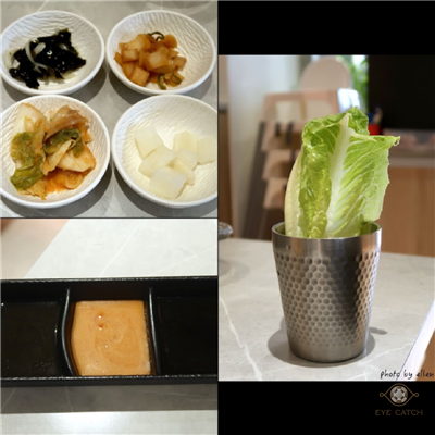幾樣小菜還可以, 洋蔥醃過仍帶嗆辣, 泡菜不會太酸, 柚香蘿蔔入味, 海帶芽酸甜可口, 聽說皆是店家自製! 佐醬有桔醋醬/味噌燒肉醬/紅酒燒肉醬, 我喜歡混著沾