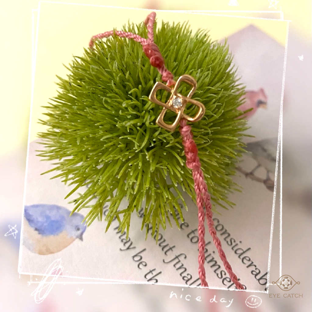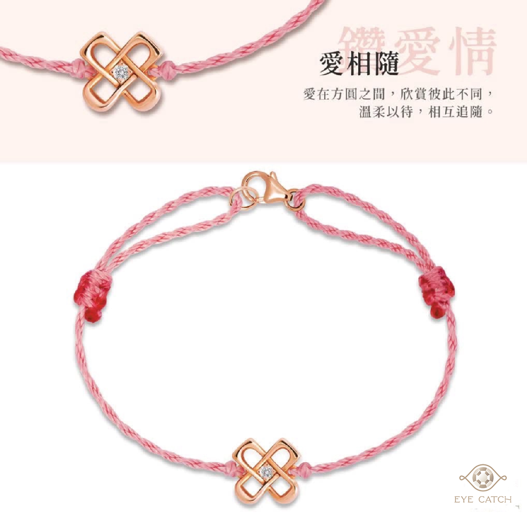 粉嫩手繩綁住溫柔心意,心形玫瑰金搭配小巧鑽石,像極了你眼中的那摸甜蜜之光。