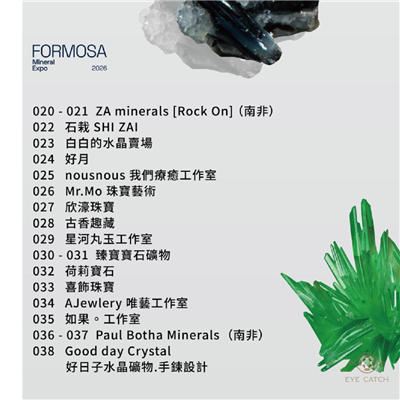 FORMOSA象徵美麗,如同來自世界各地甚至星際的礦物寶石,將齊聚美麗島綻放光彩!眾位礦商、珠寶品牌與礦石藝術創作者,精心籌備整理許多國際新礦和各種晶體寶石到設計作品,預期將能一次滿足愛礦朋友們在欣賞收藏與學習的多重樂趣~ 誠摯邀請您前來參與,一同感受礦物寶石的非凡魅力。