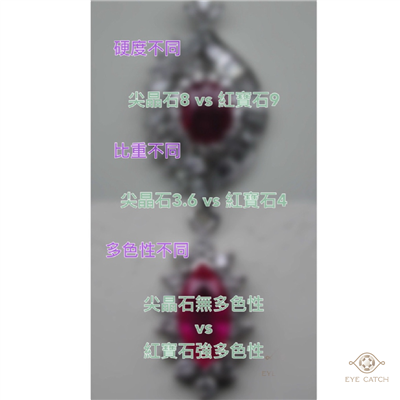 比較紅色的尖晶石與紅寶石的同語義,不同的有,硬度不同金晶石的硬度為8,而紅寶石硬度為9。切割陵線銳利度不同,比重不同尖晶石的比重為3.6,而紅寶石的比重為4,手感略有不同。多色性,尖晶石沒有多色性,而紅寶石有強二色性。