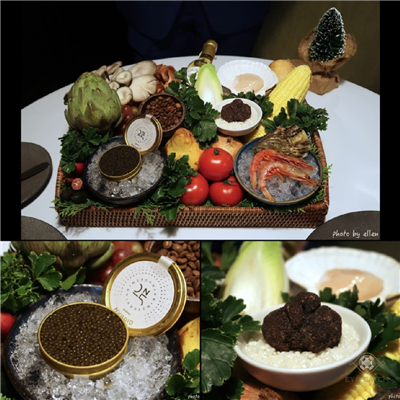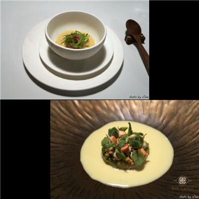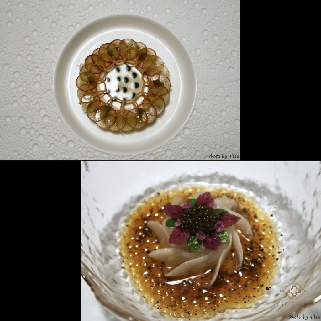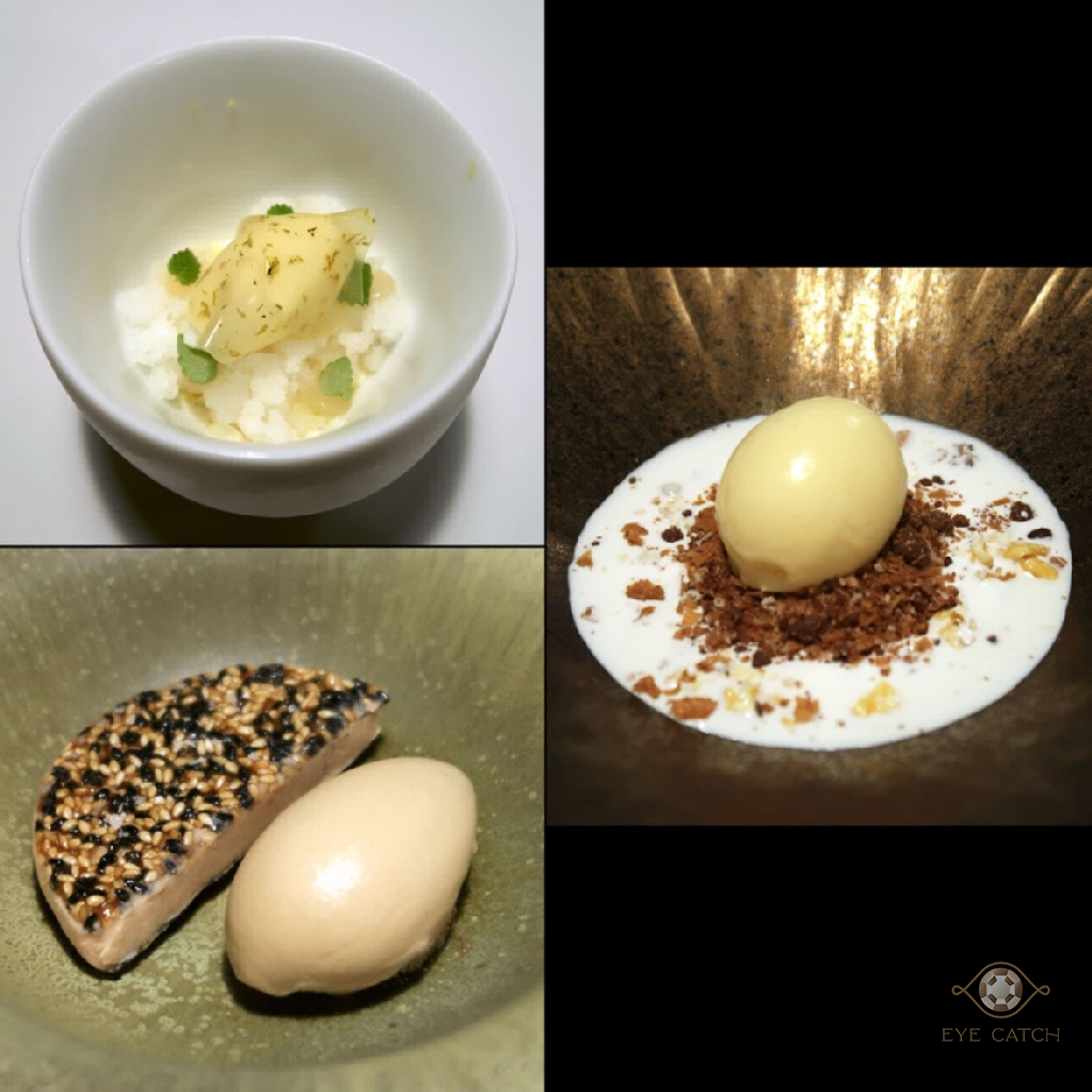 這天晚餐: 甜蝦, 海膽鬆餅, 日本南非鮑魚烏骨雞湯, 鱈場蟹燉飯&日本赤醋, 北海道干貝, 愛媛縣蜜柑鯛, 鹿兒島A4和牛紐約客, 米飯料理&辣油, 羊奶冰淇淋&黃酒, 酸奶甜粥&人參冰淇淋