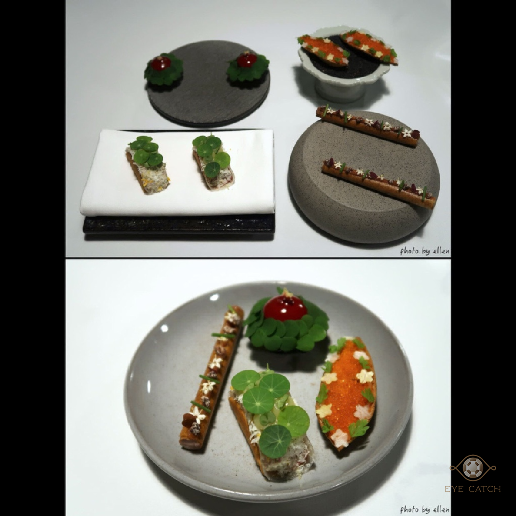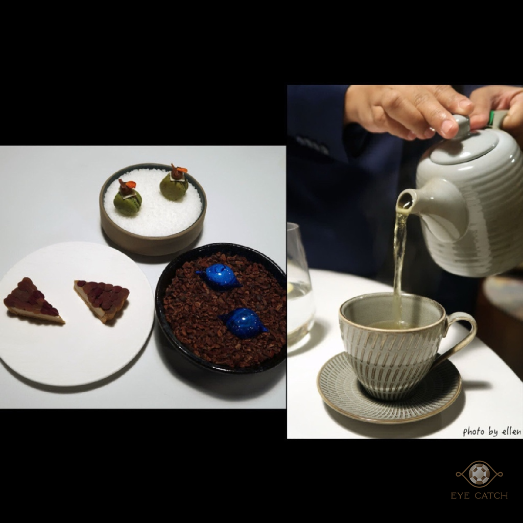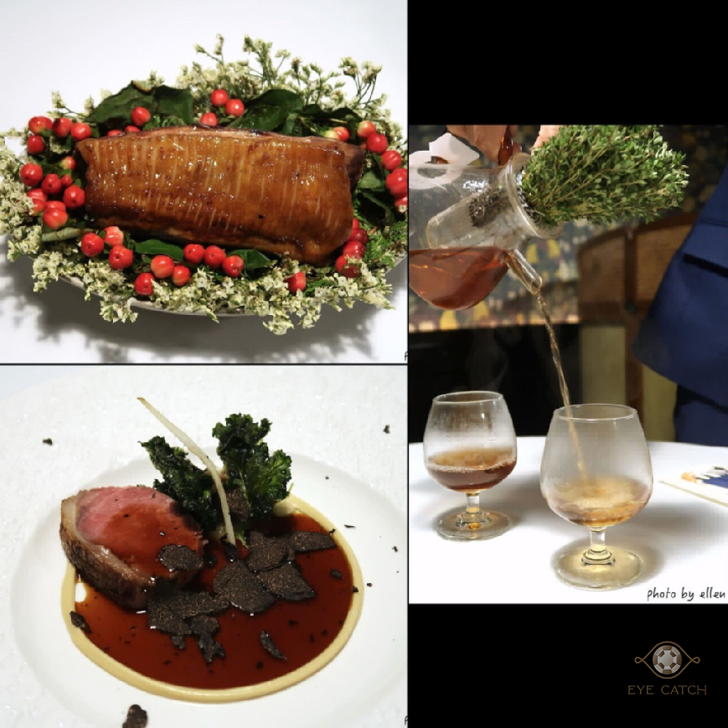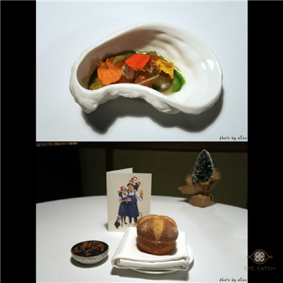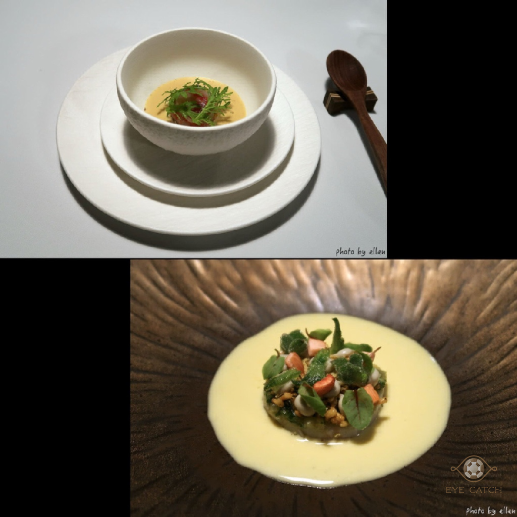 那日餐點有: 生蠔, amuse bouche (甜菜根鰤魚塔/鮭魚塔/鴨肝雪茄/牛舌塔可), 酸種布里歐麵包&油蔥奶油, 蟹肉冷湯, 北海道干貝與黑鮪魚, 紅蝦茶碗蒸, 油封鱈魚, 慢烤羊鞍, 黃白水果冰沙, 甜點x2, petit four & 薄荷茶