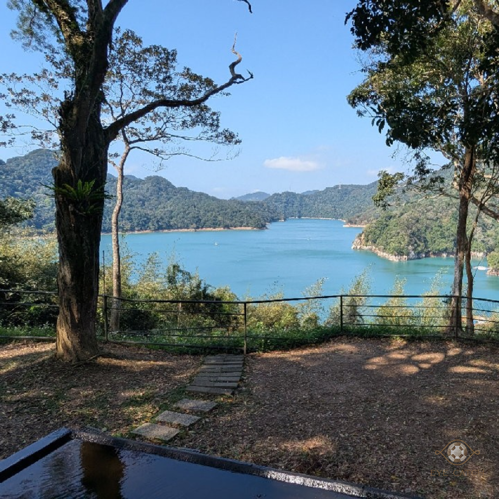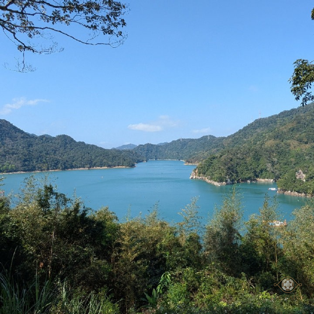 說是景觀平台,其實就是山坡邊一小塊較平的空地。 空地上有一顆樹可做為遮陽之用,樹下有設置板凳。 往下看去,真的很像一隻趴著的鱷魚,前腳伸出,還挺可愛的。 左邊有一個小半島,像隻小鱷魚只把頭露出來。 今天天氣乾爽,風景真的很漂亮。 體力不錯的話,來北宜公路可以來這邊看看翡翠水庫上遊的美麗風景。