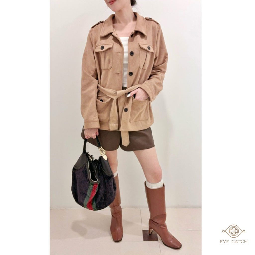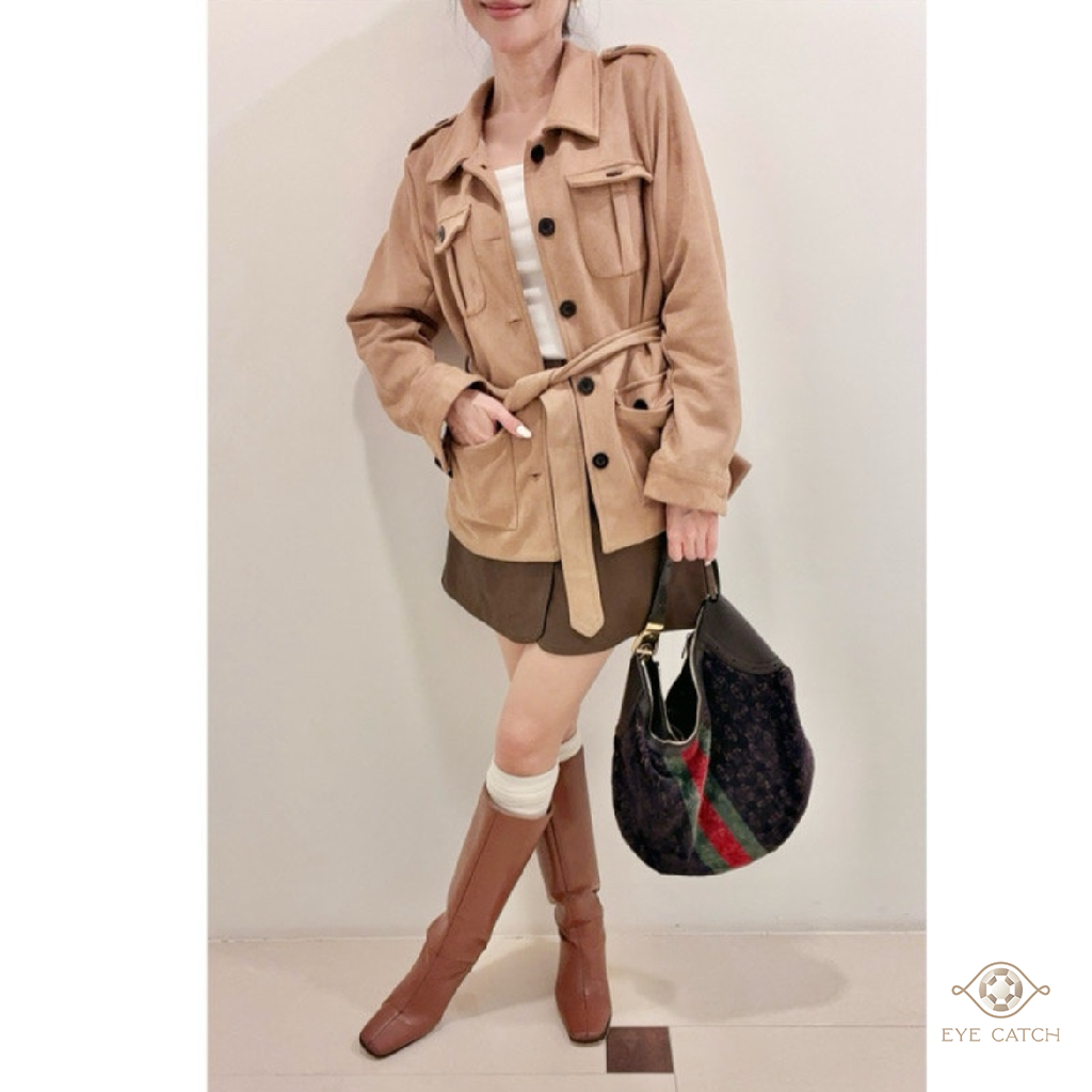 淺駝色外套俐落剪裁,腰間隨性一繫,勾勒出剛剛好的輪廓,內搭米白與深咖短褲、同色系長靴,從淺到深自然過渡,像一杯層層堆疊的拿鐵,溫潤卻不單調。