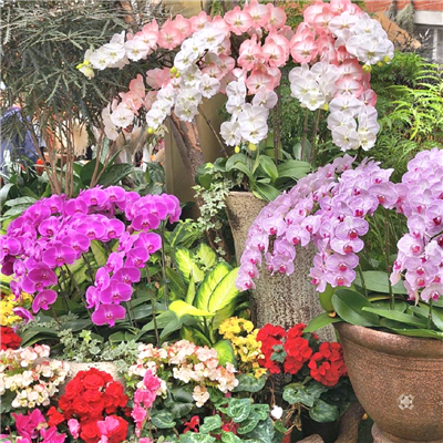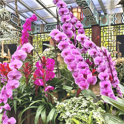 其他的蝴蝶蘭還有從高處優雅垂落,粉的、紫的、亮的、柔的,一朵朵像在比美,根本是花界伸展台。陽光灑下來,花瓣微微透光,整個空間閃閃發亮,心情也跟著亮了起來!