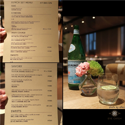 空間不大, 我們坐在U型沙發寬敞不擁擠, 只是裡面的人進出不太方便, Paul Lee擔任餐飲總監設計的菜單, 平日中午僅供應商業午餐和部分單點, 服務生強力建議我們點商午說非常划算, 的確, 若以今日我選的餐點來看, 三道省440等於打了67折差價不小, 不過商午內容無法更改替換