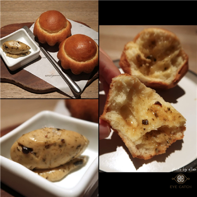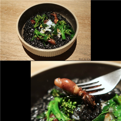 麵包搭配昆布奶油非常可口, 沙拉看起來平凡無奇但清爽開胃, 墨魚汁燉飯不錯, 甜點蛋糕看似紮實其實空洞不少像蒸糕, 冷熱交融比預期好吃許多