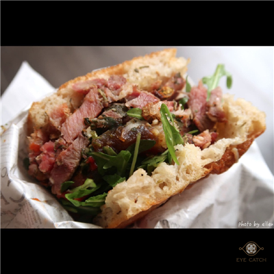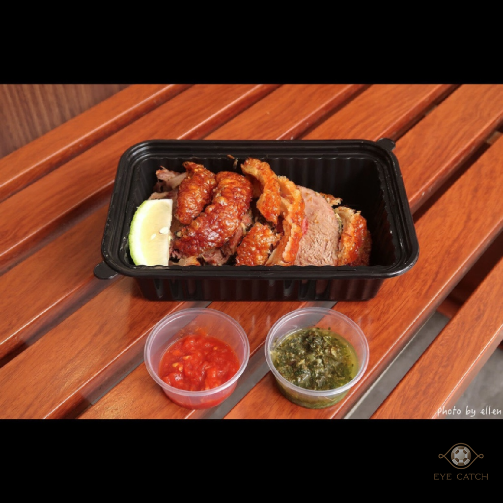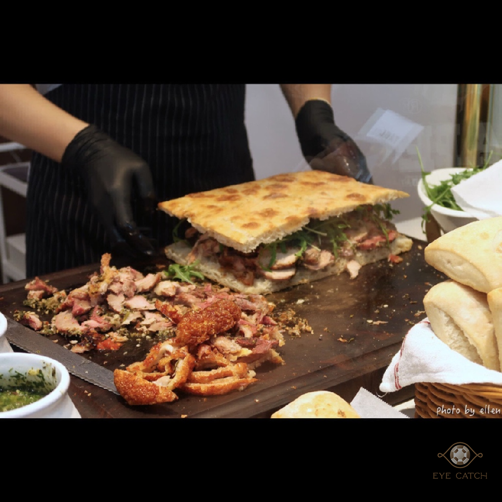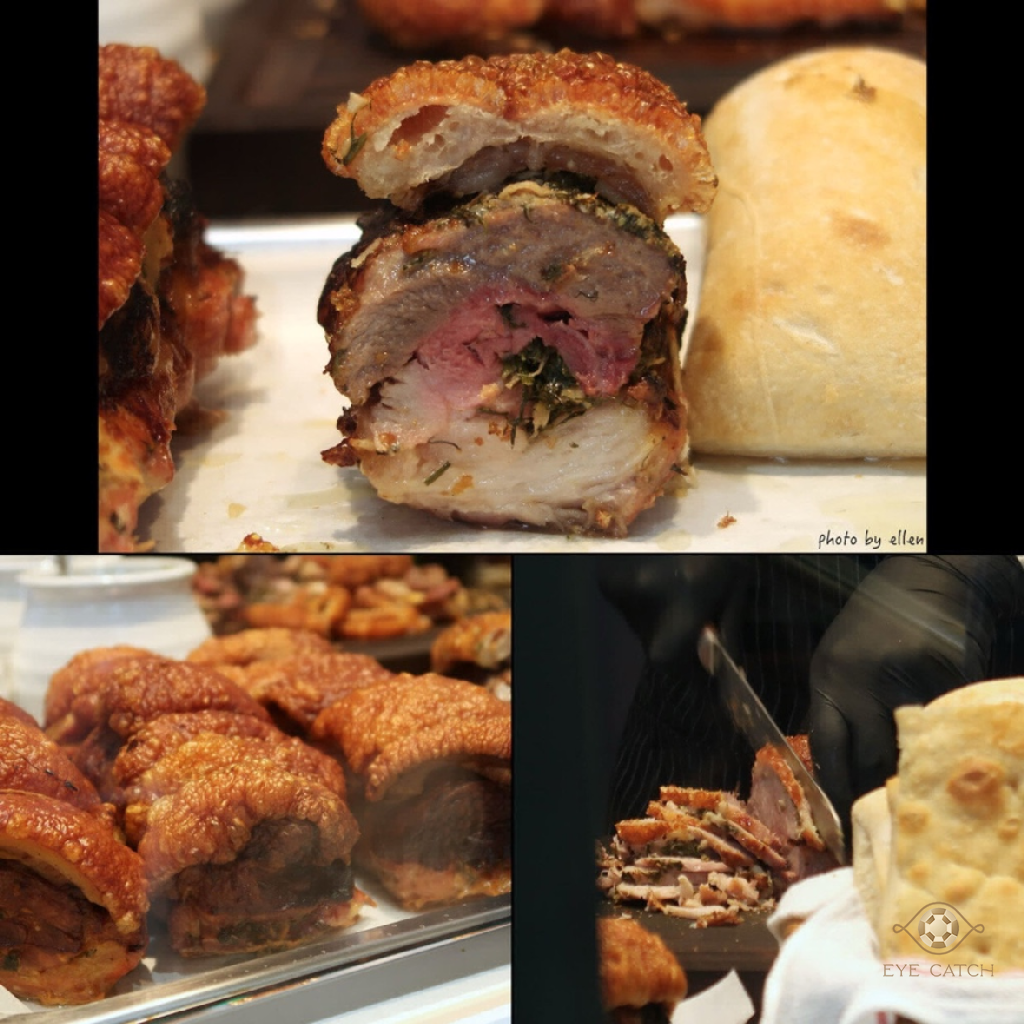 我買了半份佛卡夏三明治&經典羅馬豬肉卷切片, 後者附兩種醬和檸檬, 脆皮果然酥脆, 肉看起來乾其實挺嫩, 單吃有淡淡香料味, 沾兩種醬更好吃! 三明治更讓人驚艷, 除了青醬紅醬還有焦糖洋蔥, 比單吃肉更加豐富