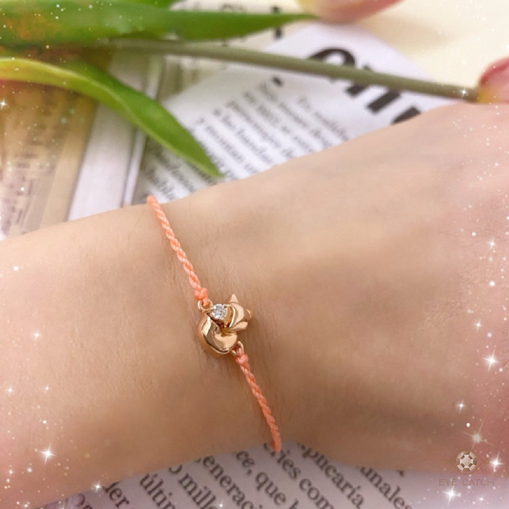 粉嫩手繩綁住溫柔心意,心形玫瑰金搭配小巧鑽石,像極了你眼中的那摸甜蜜之光。