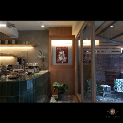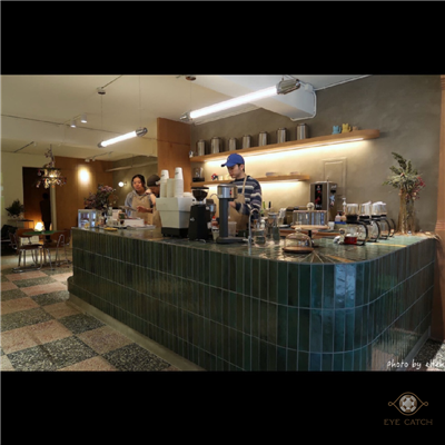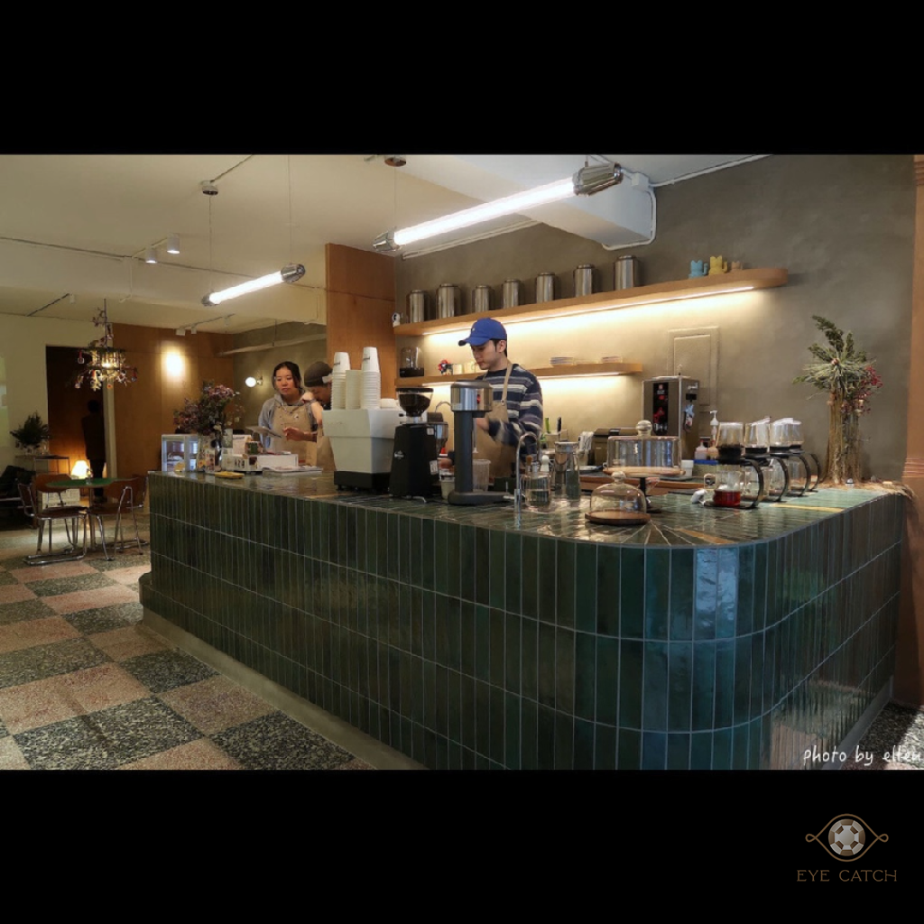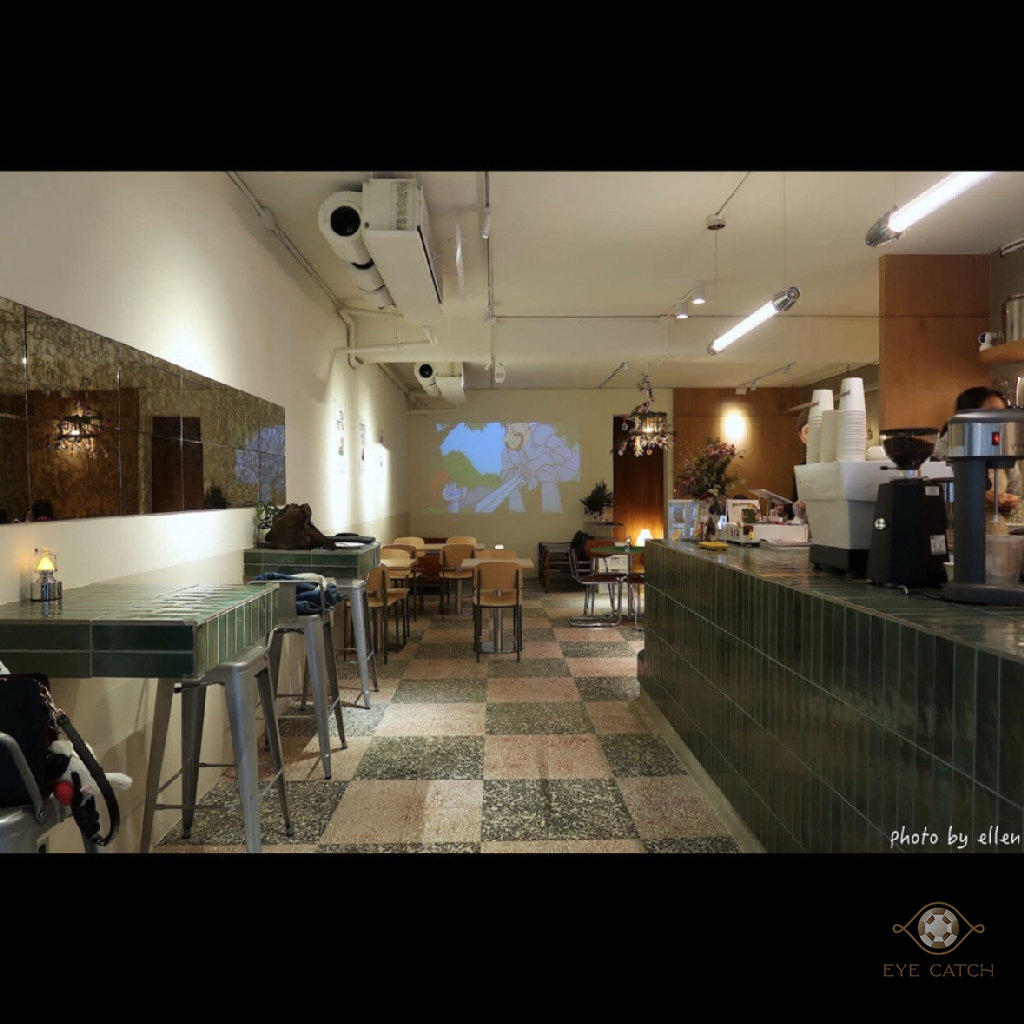 磨石子地板與翡綠色吧台搭配木頭與金屬家具塑造出獨特混搭風格, 牆上投放的影片是懷舊卡通, 不放聲音只讓畫面跳轉, 讓氛圍增添俏皮趣味, 平日下午人不多蠻幽靜, 低消每人一杯飲品, 只收現金, 平日限時3小時, 假日2小時, 滿座的話無論平假日一律限時90分鐘, 寵物友善空間