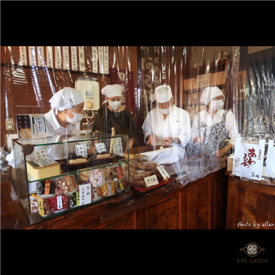不知是疫情還是正在整修所以安裝透明簾布, 店員親切招呼, 得到許可拍照, 選擇不多主要以數量區分, 三個五個或十個還有數量更多的包裝, 紅豆和黃豆粉口味可自行分配比例! 我怕三個可能太好吃後悔, 選了五入裝