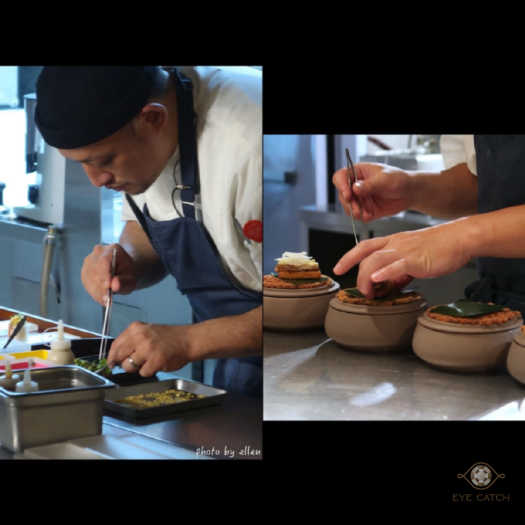 那天餐點: 迎賓飲, 前菜(甜豆仁福菜豬培根, 紹興龍膽石斑, 牛舌沙嗲假蒟, 中卷番茄絲綢乳酪), 冷前菜(鱒魚刺蔥木耳, 小米蕗蕎箭筍), 熱前菜(筍殼田雞茭白, 瓜們豆腐米泔), 主菜(台灣安格斯肋眼牛, 季節鮮魚紅椒野薑花), 主食(桃園3號 香糯米 在來米), 冰點(鳳梨油甘果酒粕), 主甜點(白蘆筍綠蘆筍薑), 茶點(愛玉芒果青佛手瓜, 草莓包種茶圓葉胡椒), 餐後飲料