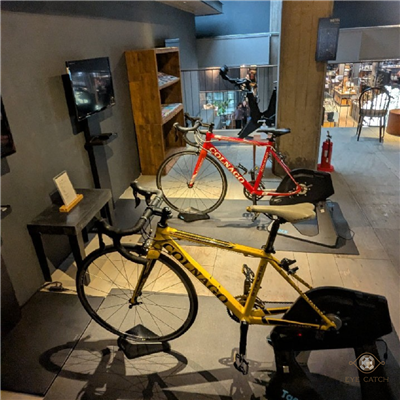 從櫃檯上樓梯後有一個小空間可以俯看整個U2,除了有些桌椅和書報可供休憩,旁邊還有一台Garmin智能擬真訓練台和兩台直立訓練台(要架上拆後輪的腳踏車)可以使用,可能甚至可以用自己的車來訓練吧。