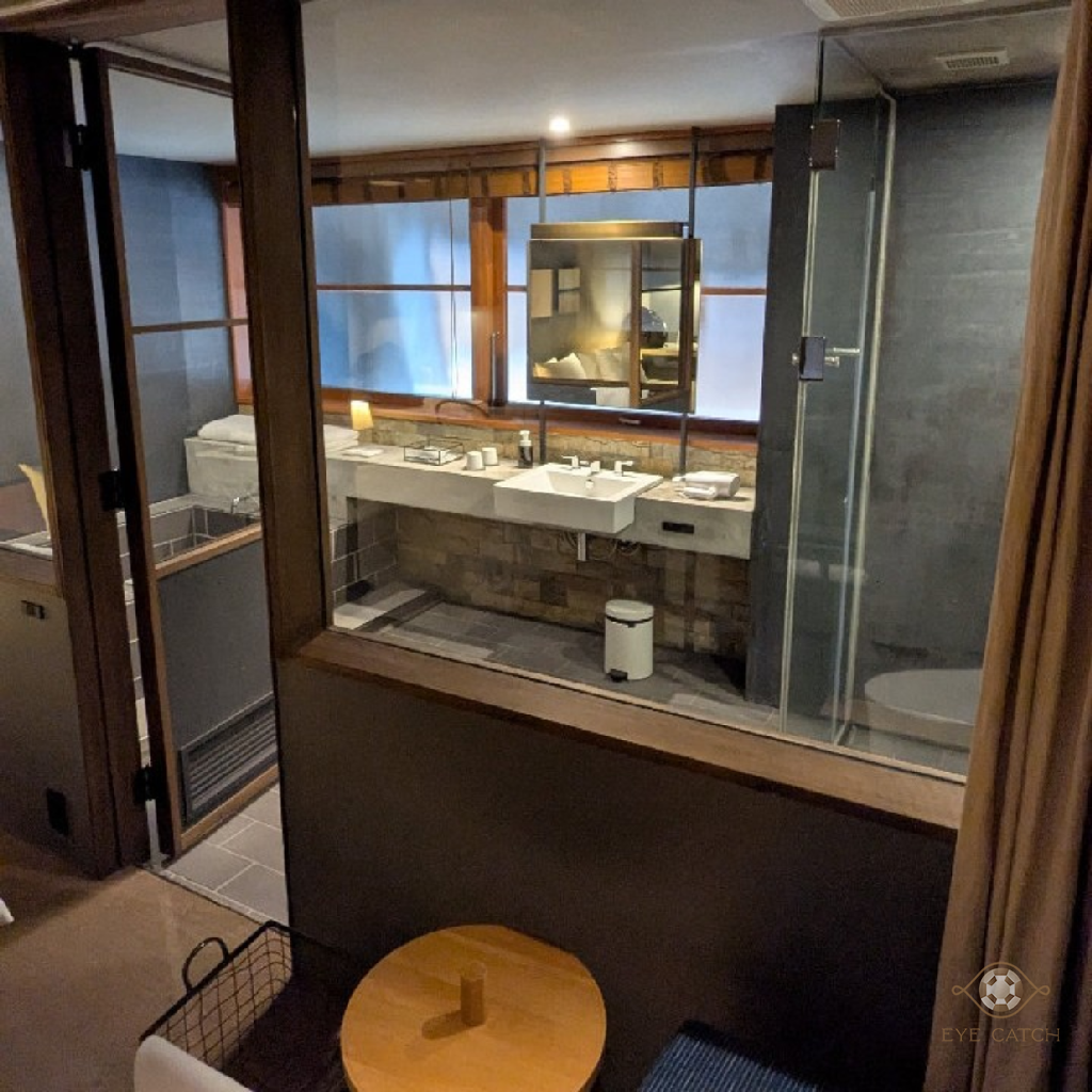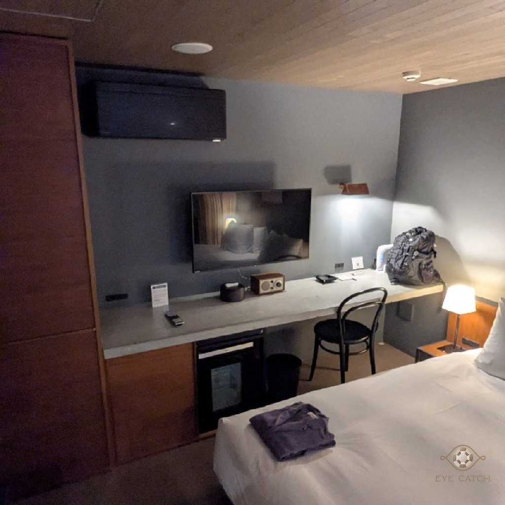 房間裝潢風格簡潔,有木頭、浴室地板和澡盆是石頭,算是各種元素都有一點的混搭風吧,俐落中帶點溫暖。 燈光不會很亮,對騎車騎累了的人應該蠻舒服的,應該很好入睡。