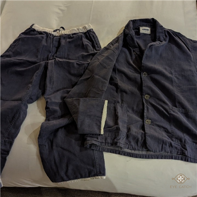 旅館的睡衣睡褲布料很厚實,摸起來稍微有一點點粗粗的,像是很古早的布料。