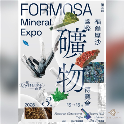 第三回福爾摩沙國際礦物博覽會 將以《顯‧晶質|Crystalline》 開啟新的篇章!聚焦於礦物晶體的多樣形態與細節之美,呈現不同礦物於各異地質環境中所展現的外觀變化與生成特性,邀請觀者走入一個不僅關乎多樣的種類,更關乎形態、歷程與時間深度的礦物世界。 從第一回望向「臺灣礦物」的根源,到第二回映照收藏者內心世界的「心礦物」,再到第三回將述說「顯 晶質」一步步累積、凝聚,讓輪廓愈發清晰。 礦物晶體的誕生,象徵自然界中晶體結構清晰可見的地球物質,不僅描述礦物或火成岩中顯著的晶體形態,也顯現物質由生成、調整而趨於完善的過程。 這樣的過程就像自然界緩慢孕育秩序、走向純化與成熟的生命軌跡。在地質作用長時間淬鍊下,礦物晶體長成各樣豐富的樣態—晶面、色澤、組構與形態,皆記錄著其經歷的環境與演化歷程,成為大地深處所孕育的珍貴瑰寶。 【展覽亮點】 V國內外展商匯聚,一次欣賞精彩寶礦 V權威專家講座分享 V 顯晶質主題體驗活動 _______________ 日期:2026年 3月13-15日 場地:台北市 松山文創園區 2號+ 3號倉庫EyeCatch 1 -