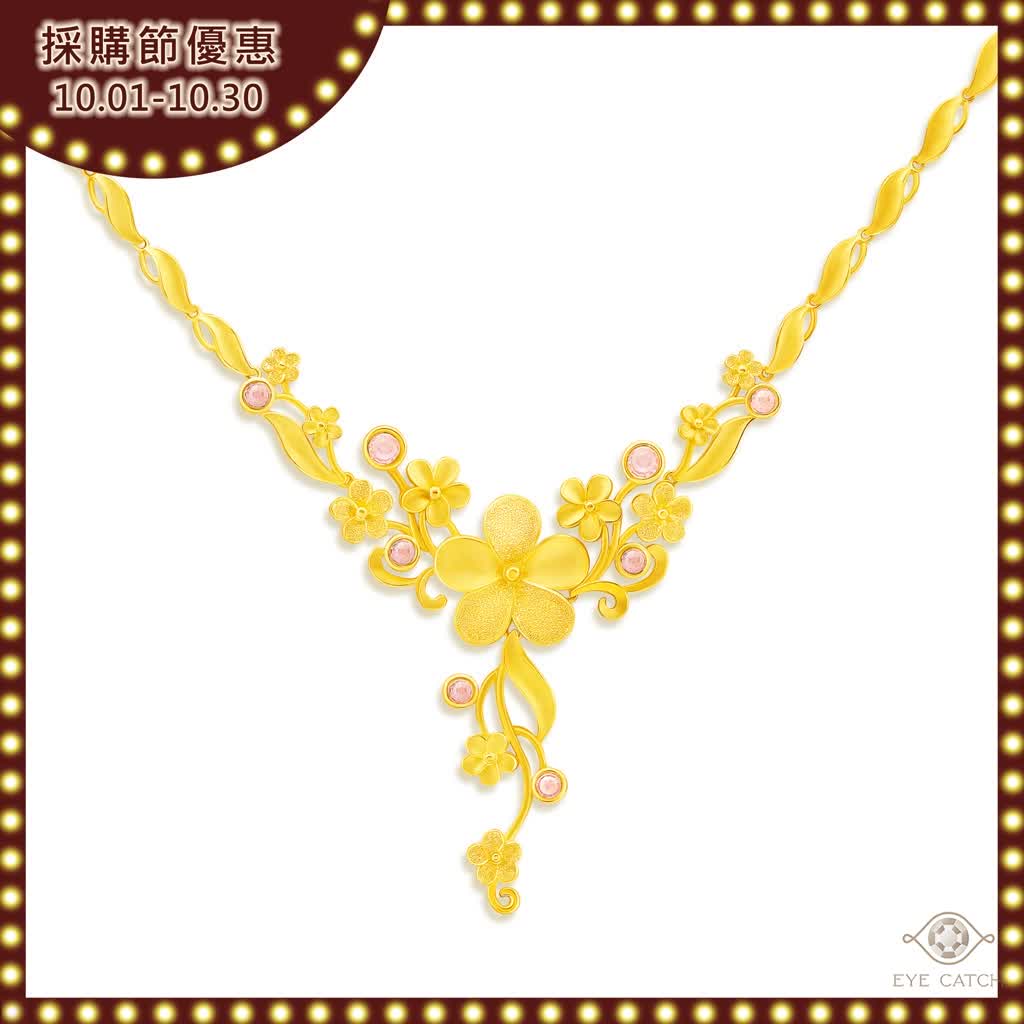 與其他黃金套組最大不同在於癡心項鍊多了粉晶做點綴,粉晶像是花朵上的露珠,晶瑩剔透,美麗純淨,充滿陽光的朝氣,夜裡又像夜明珠般璀璨,令人炫目