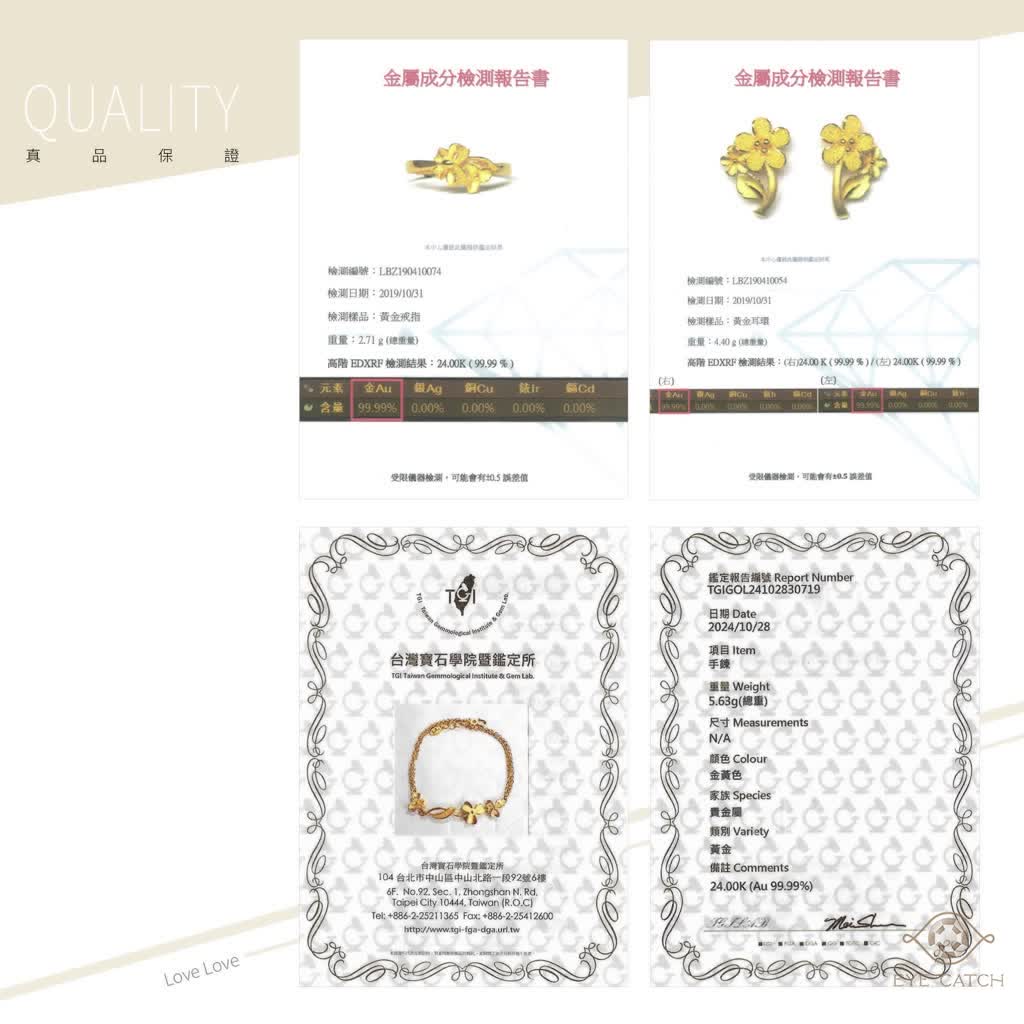 純足黃金手鍊兩條、純足黃金耳環一副、純足黃金戒指一枚